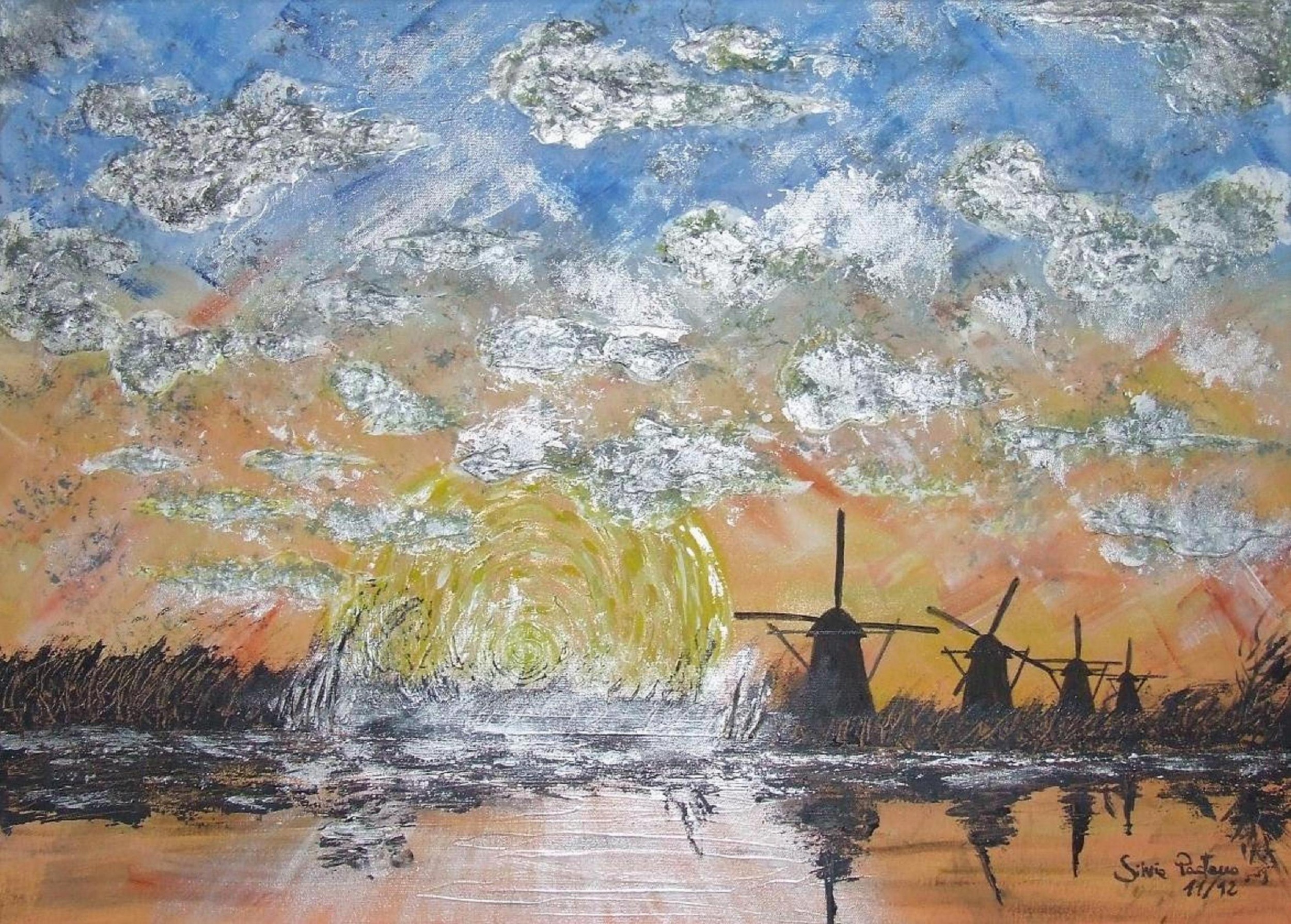 Devo dire che non amo particolarmente i paesaggi ma questi tuoi ulini hanno qualcosa di assolutamente affascinante; un cielo materico, quasi metallico, duro e severo i mulini sembrano "sbucare" timidi dal paesaggio con un effetto davvero singolare. Complimenti.