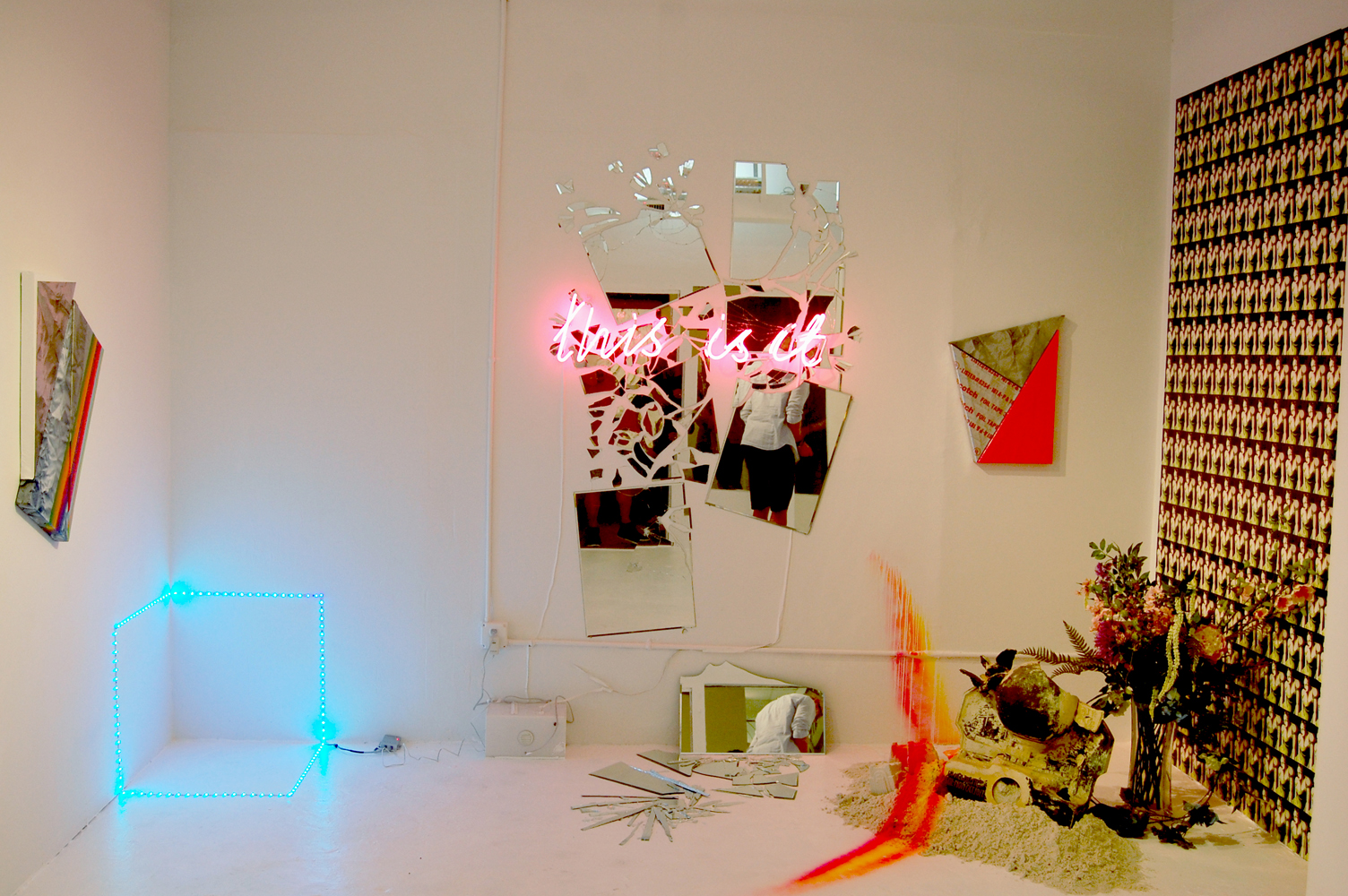 An installation exploring the thought of 'The End of Times', Mayan calendar versus the thought of "Eternal Return' as proposed by Heinrich Heime. An installation composed of found objects, such as a cracked plaster World Globe fountain, metal vase, roll of barbwire, ceramic hand figurine with crossed fingers, Faux flowers, postcards mounted as a wallpaper, spray painted sand castles, neon text sign, broken mirrors, multiple shaped collage canvases, LED-Light sculpture, a dead dragon fly, Mona Lisa pussel, glue and gold leafed ceramic religious motive plate on wall.