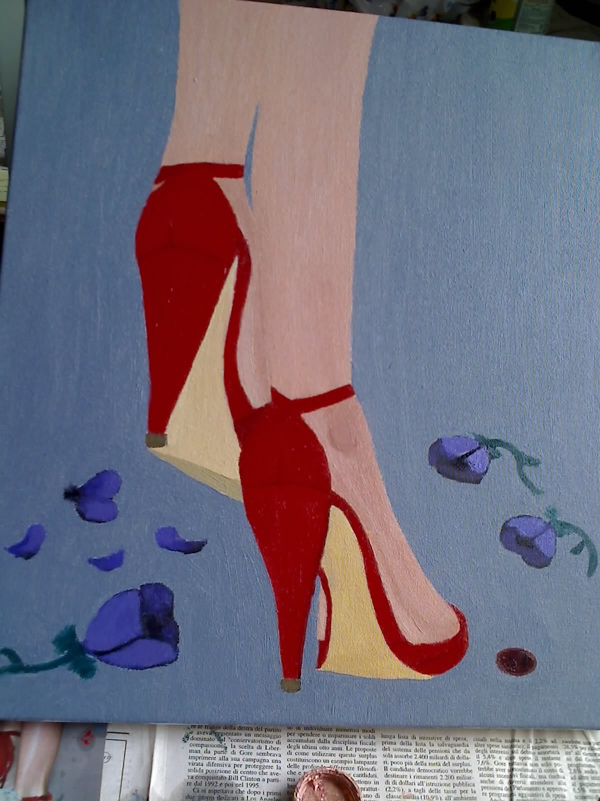 Sensulmente delle scarpe di vernice rossa con tacchi a spillo calpestano deliziosi anemoni immobili per terra.