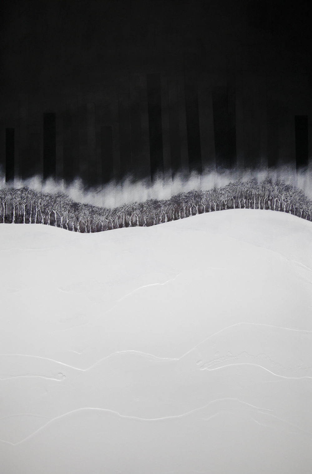 Opera realizzata a penna e smalti su tela, una riflessione su l rapporto tra l'uomo e l'ambiente, la natura e la città attraverso l'interpretazione del linguaggio visivo, il gesto e l'uso dei materiali sintetici.