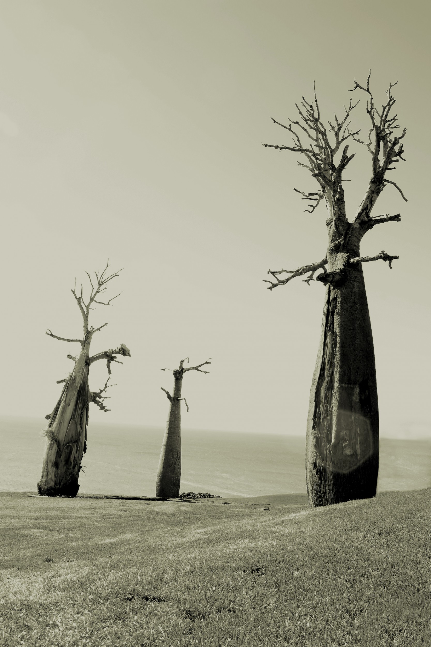 For many years now, I have looked over the hill toward the east coast, from my home, to see this stand of old boab trees, Adansonia gregorii, a tree endemic to Australia. Recently, I located them and photographed them. They are no longer living, now standing as sentinels to remind us of their former presence. Perhaps they suffered a natural death, (they are most commonly found in the dessert zones of Australia) succumbing to the south westerly salt laden winds of the coast of New South Wales. Perhaps they were poisoned to optimise coastal views. They moved me, like a poetic metaphor of our current environmental concerns and greed. A sculpture for our troubled times. Like sentinels, they are looking out to the sea and land for incoming hostility. I lament.