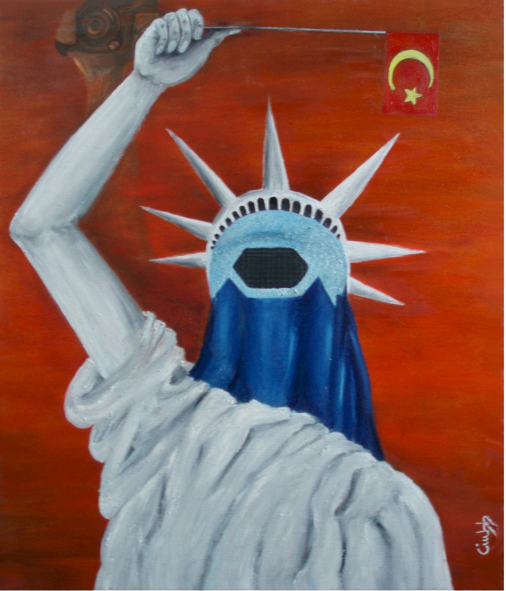 statua della liberta'(america) con burka, in mano bandiera cinese( paese emergente)e si intravede braccio con telecamera.