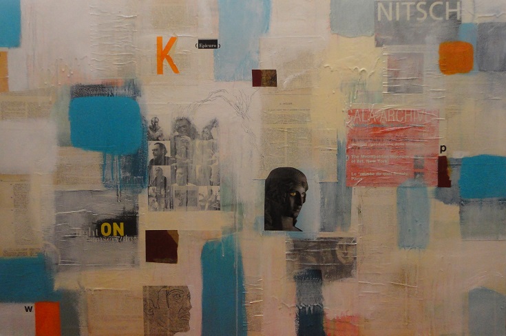 E venne il momento in cui la prosa, la letteratura, l’arte dello scrivere e del raccontare, il poema e la poesia emersero dal fondo delle idee e tra bianchi, ocra ed azzurri andarono a rischiarare i volti, i gesti e i segni impressi su una tela. Questo racconto delle arti della scrittura è palesemente non celato nell’opera “Il Principe”. Machiavelli, Josè Saramago, Italo Calvino, Torquato Tasso, Ludovico Ariosto e Charles Bukowski riempiono gli spazi dello scrivere, Epicuro quello della filosofia, Nitsch, Kounellis, Merz, Shirin Neshat quelli dell’arte, Andrea Sterpa racconta, colma i vuoti già pieni, osserva ed ha il piacere di averli citati tutti, raccolti in un’unica opera e con rispetto continua ad osservarli e ad ammirare Cicerone che nel suo trattato “De finibus bonorum et malorum” fa esporre da un interlocutore una descrizione sistematica del pensiero di Epicuro e dei suoi discepoli.