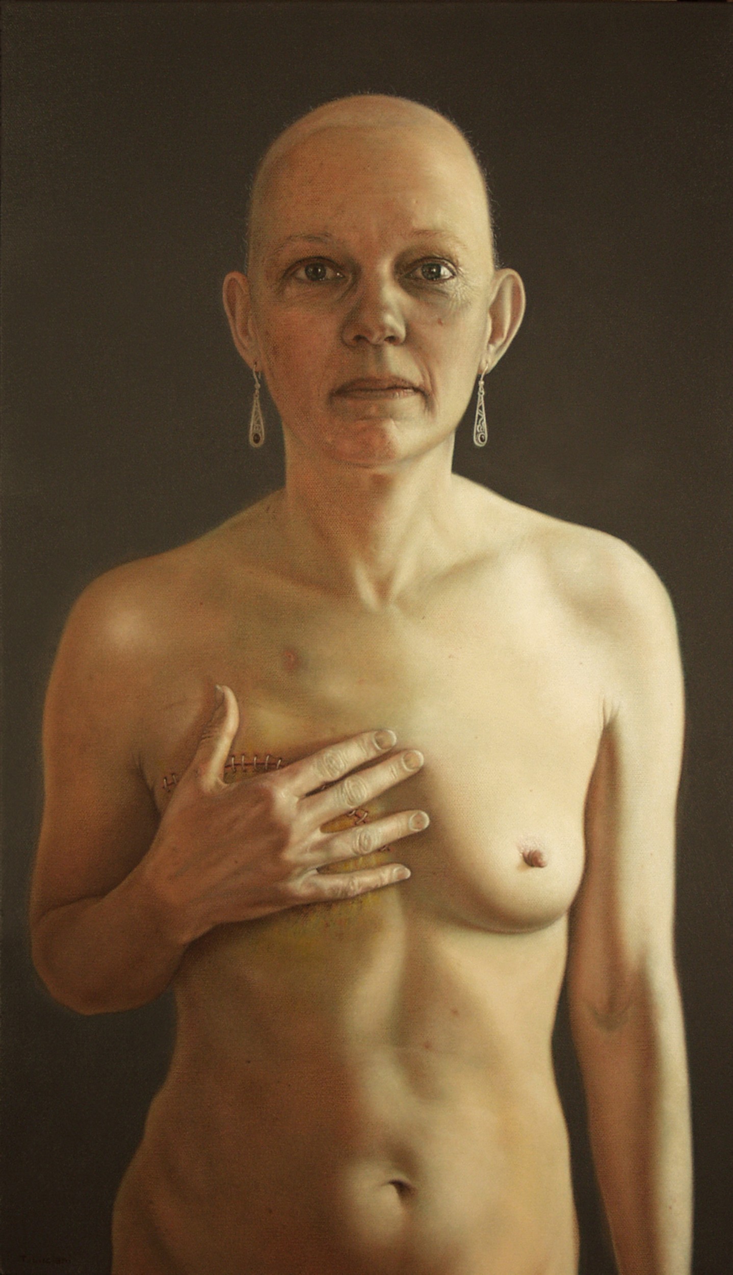 The painting, Wonder Woman began as an intense emotional response to my former partner’s breast cancer diagnosis and her courageous voyage to find healing. I witnessed first-hand the many setbacks of the psychological and physical challenges to which people in her situation are subjected. In the portrait, I tried to capture Monica's spirit of quiet strength yet to acknowledge the helplessness cancer brings.
