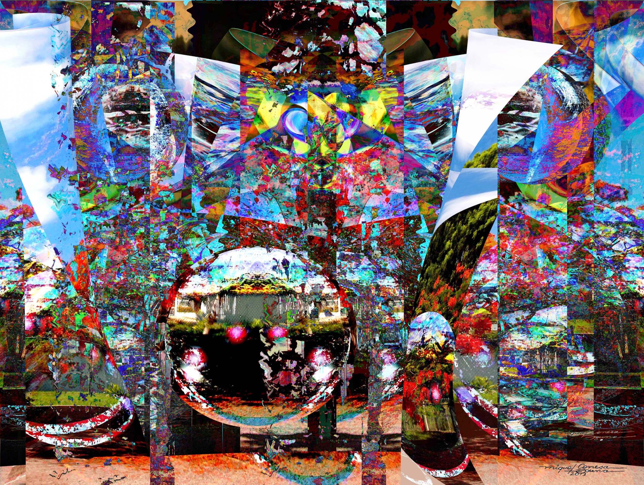 Invading Spaceships (Naves Invasoras / Astronavi Invasori) is one of the dozen of images of this sequence of works inspired on an extraterrestrial invasion to the planet earth. This image in particular, does have as a background an urban landscape within a public park nearby from where I live. I have done about a dozen or more realistic drawings and small paintings studies of this park, which is the background of trees and mature for the final effect of these conceptual ideas about the landing of hi-technological elements of an advance galactic civilization. Although this image, like many other of this sequence do show an abstract outcome, the painting overall concept is close to realism. My work is a fusion between traditional and contemporary concepts influence by the digital media and the special effects seen in many science fiction movies. This work as well as others in this whole series has been inspired on a number of science fiction films on extraterrestrial invasions, especially on the classic film of 1951 and on the second version of 2008 entitled: “The Day the Earth Stood Still”. My concept of hi-technology is the fusion and combination of natural-organic elements with high intelligence crafted tools that can make a number of encounters, events and apparitions look as supernatural or paranormal wonders. My work implies changes and the advancement of how technology will be able to perform all sort of visual bionic effects. The science fiction of the past is the reality of the technology we have today. The simple thought that we are not along in this vast universe implies that visitors from other distance planets and galaxies will someday will land out in the open with advance technology that allow them to move with efficiency and with resources that will surpass any of our present knowledge on space travel, high speed and safely landing on any far away planets regardless of the atmosphere traits. My work has to be viewed for its well thoughtful content, originality and conclusion.