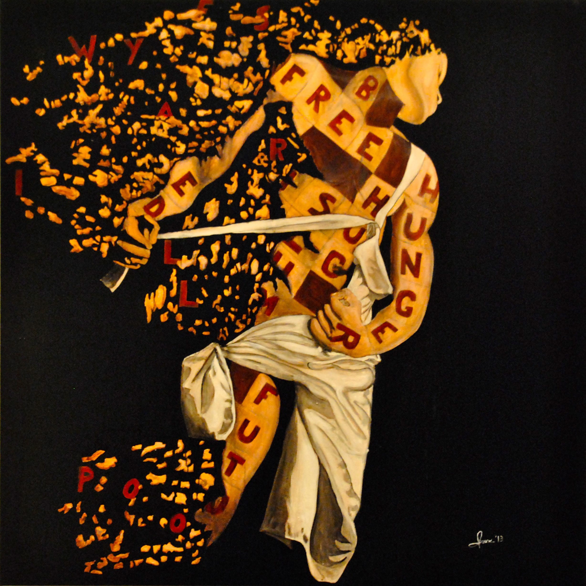 L’opera cerca il compendio tra lo sgretolamento dell’uomo con passare del tempo e il testo che riporta le parole che esplicano quello che ci aspetta se non cambiamo qualcosa.Le parole compongono il seguente testo: ”YES BE FREE it’s FABLED, but with the HUG of the SLUMP in the FUTURE will be WAR, HUNGER, POOR”