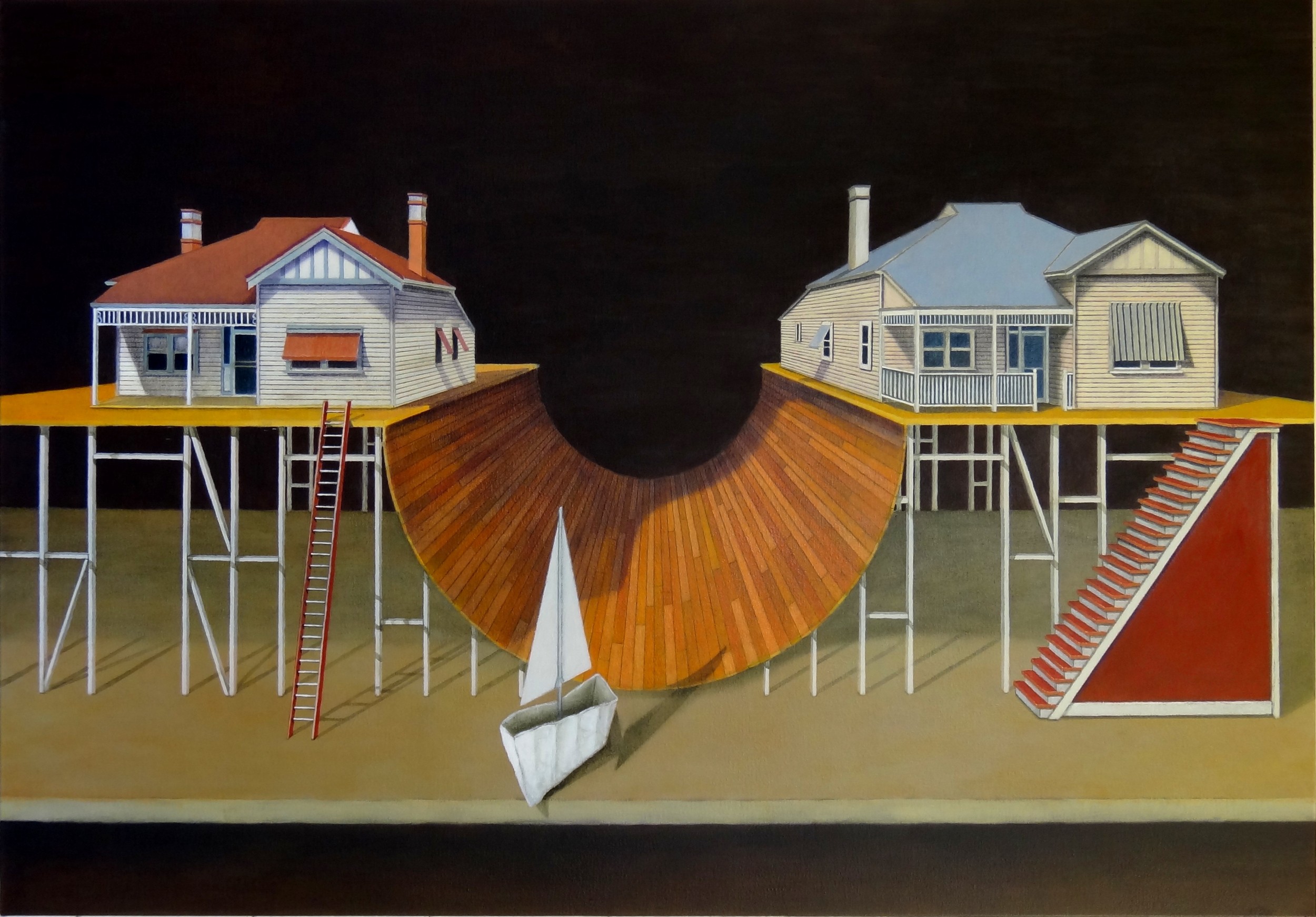 The paintings themselves function as architectural sketches as a means of planning and imagining new built environments. Stephen presents these forms within an imaginative space so his structures and objects take on a new meaning, allowing the viewer to actively participate within the space and discover new meanings in things that are normally familiar to us in our everyday lives.