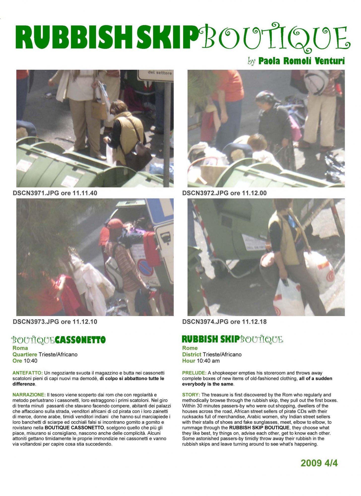 STORY: The treasure is first discovered by the Rom who regularly and methodically browse through the rubbish skip, they pull out the first boxes. Within 30 minutes passers-by who were out shopping, dwellers of the houses across the road, African street sellers of pirate CDs with their rucksacks full of merchandise, Arabic women, shy Indian street sellers with their stalls of shoes and fake sunglasses, meet, elbow to elbow, to rummage through the RUBBISH SKIP BOUTIQUE, they choose what they like best, try things on, advise each other, get to know each other. Some astonished passers-by timidly throw away their rubbish in the rubbish skips and leave turning around to see what’s happening.