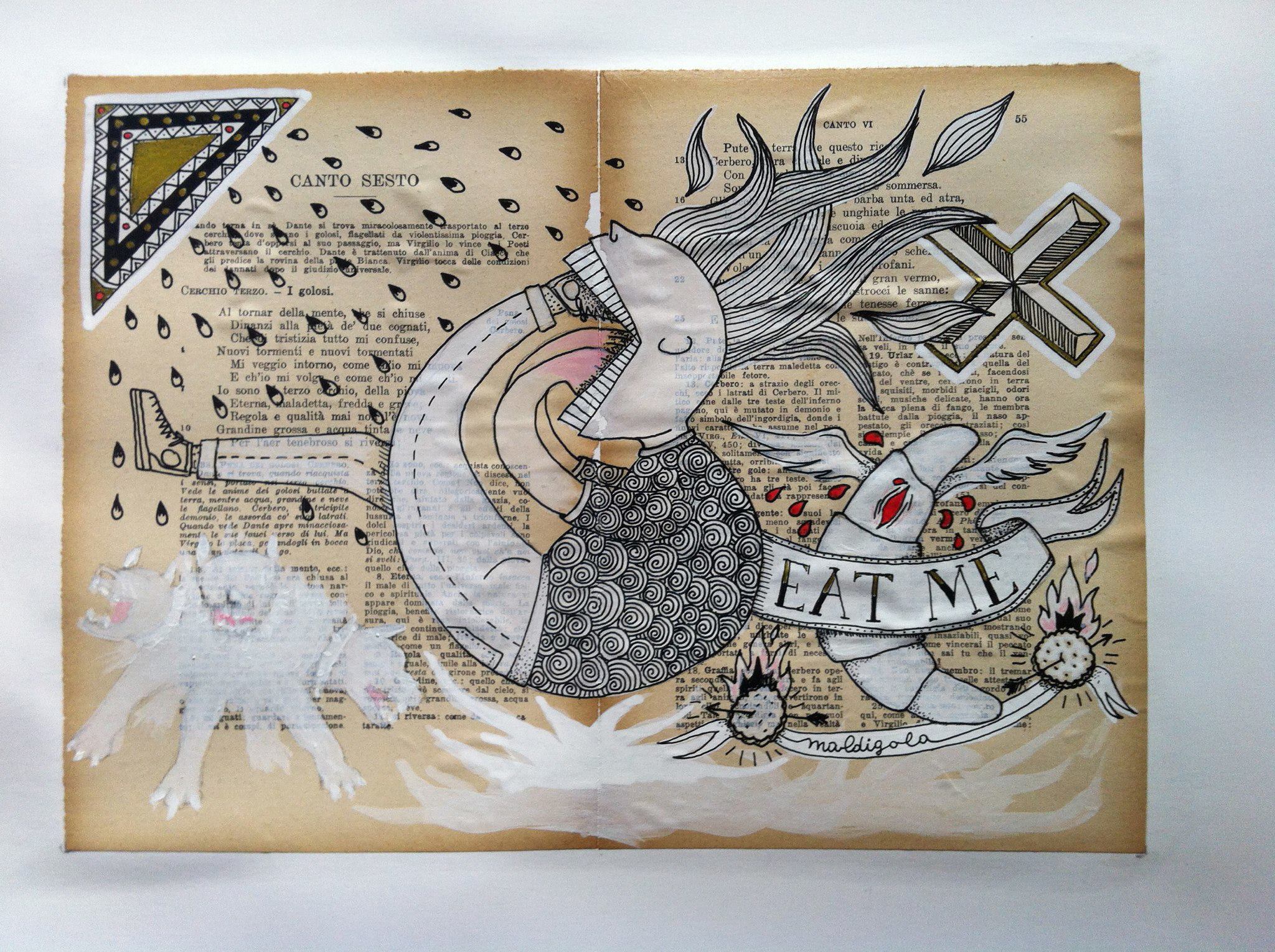 Le pagine ingiallite di una vecchia edizione della Divina Commedia stampata negli anni ’50 diventano il supporto per la mia rilettura attuale, critica, ironica e un po’ dissacrante che colma la distanza tra passato e presente, tra l’uomo di ieri e quello di oggi, lontani l’uno dall’altro soltanto nel tempo, ma uguali di fronte alle debolezze insite nell’animo umano.