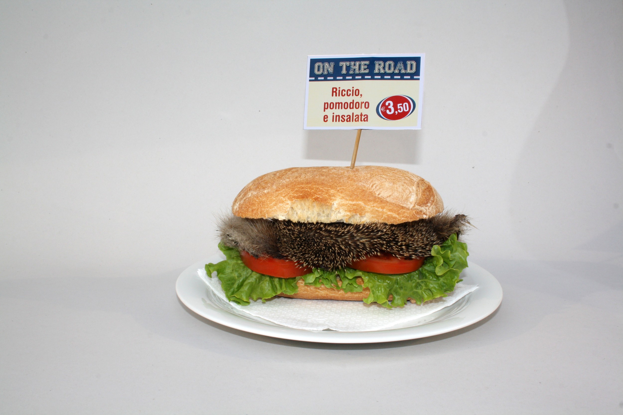 Si tratta di un panino realizzato con pomodoro, insalata e pelle di un riccio investito da un'auto.