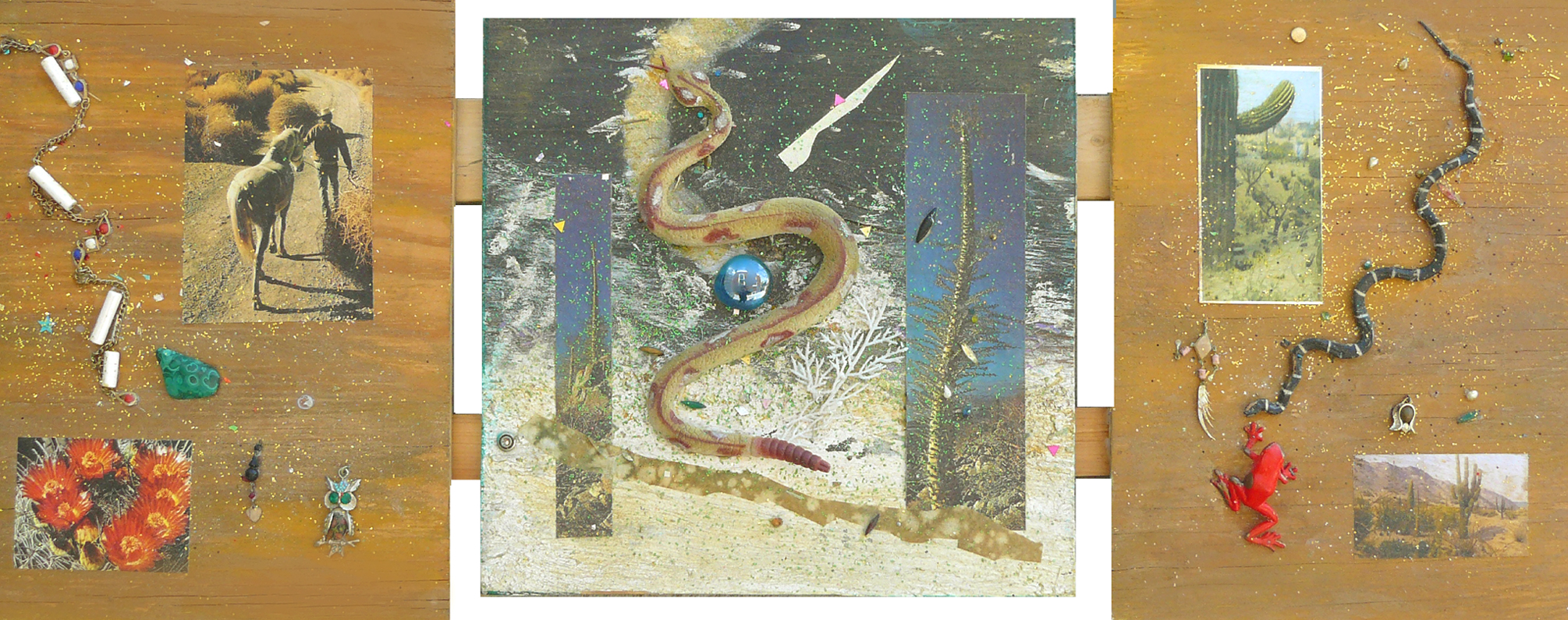 From the Mystical Desert series of mixed medium assemblages. 3 wood panels, lightly painted with acrylic allowing the wood grain to partially show, then collaged papers, photos and 3d attachments allowing the mysticism of the SouthWest USA deserts to evolve.
