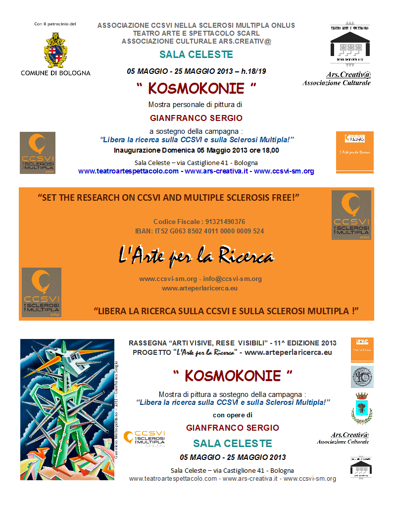 Locandina Mostra personale di Gianfranco Sergio in Sala Celeste Fotografia Digitale, Libertà, Illustrazione, Tecnica mista, 148x210cm Tecnica mista campagna ricerca liberà sulla ccsvi Locandina Mostra di pittura "KosmoKonie" - Sala Celeste a Bologna dal 05 maggio 2013 al 25 maggio 2013 con opere di Gianfranco Sergio Inserita 12 anni fa 0 Mi piace Non piace più 0 Commenti 142 Visite Condividi Facebook Twitter Google + Non ci sono mi piace Commenti 0 Inserisci commento E' necessario effettuare il login o iscriversi per inserire il commento Login