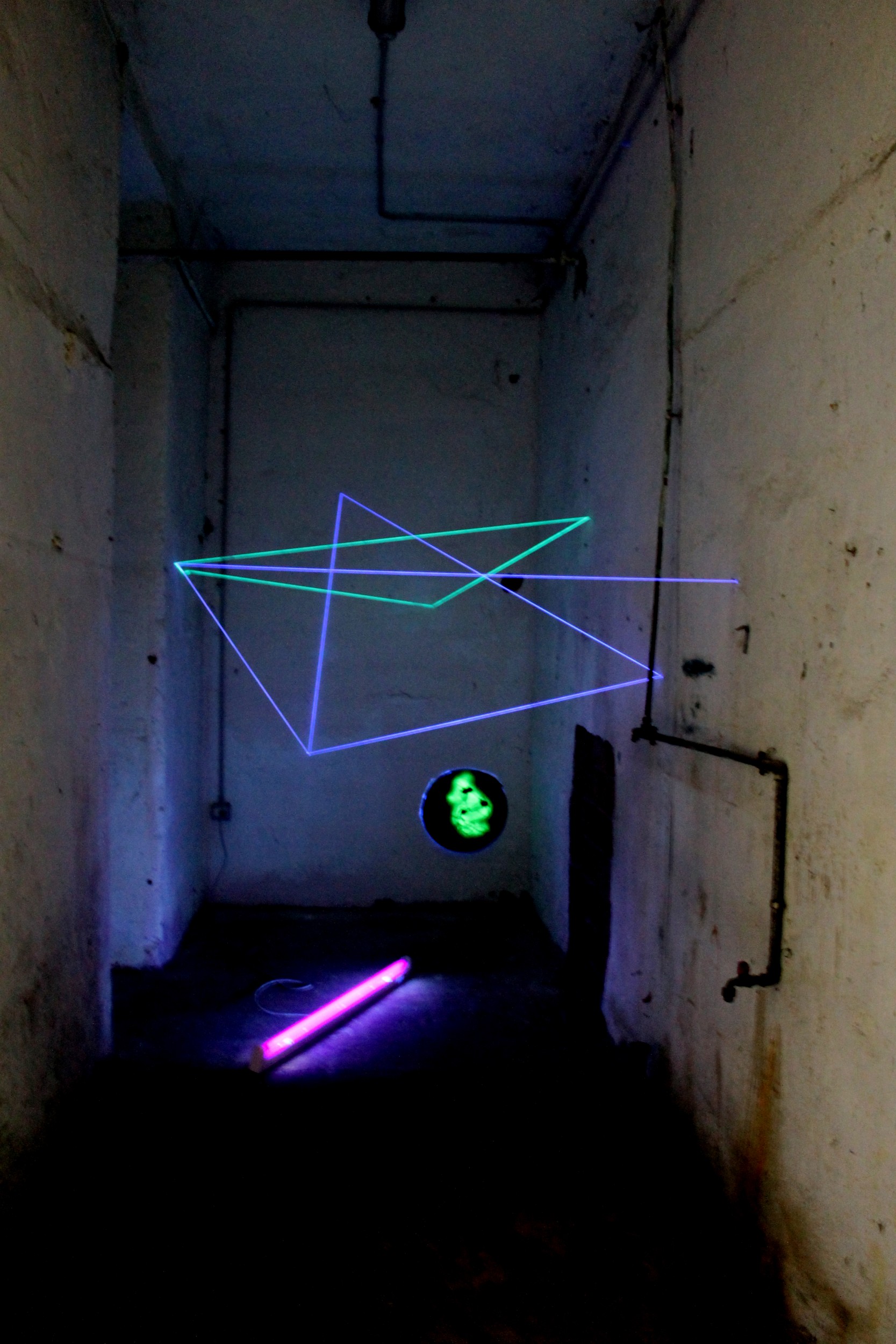 L’installazione ‘Senza tempo’, realizzata con elementi luminescenti e irradiata dalla luce nera di Wood, pone lo spettatore al centro di complesse relazioni spaziali ed emotive sollecitandolo a considerare la molteplicità delle sembianze della realtà.