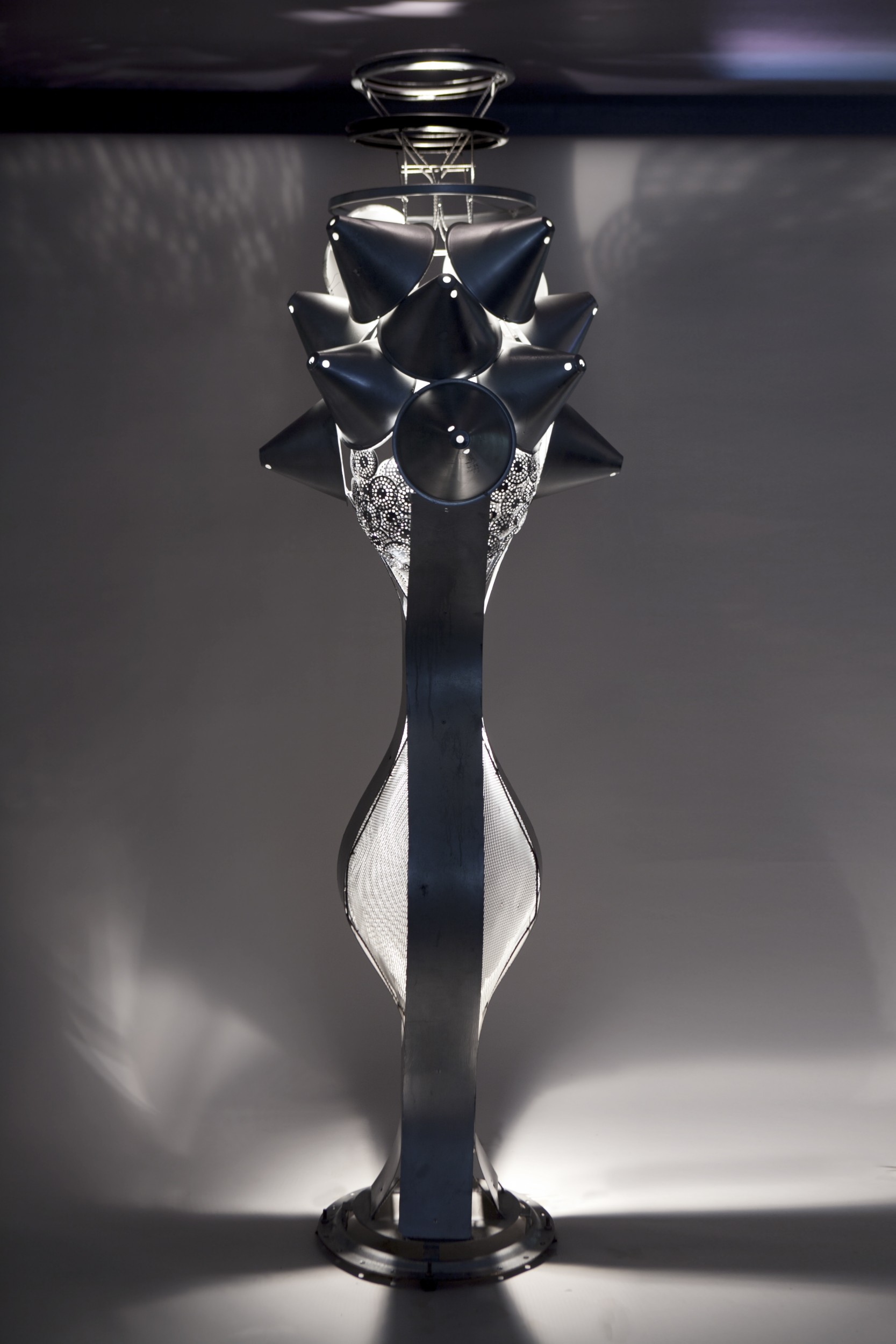 Una scultura giunonica che mima le forme di una donna prosperosa e attraente. Materiali diversi tra loroper uso e tipologia, come sezioni di tubo, lamiere,salva briciole, ferri per cemento armato, che si combinano insieme in un mix perfetto e spettacolare.