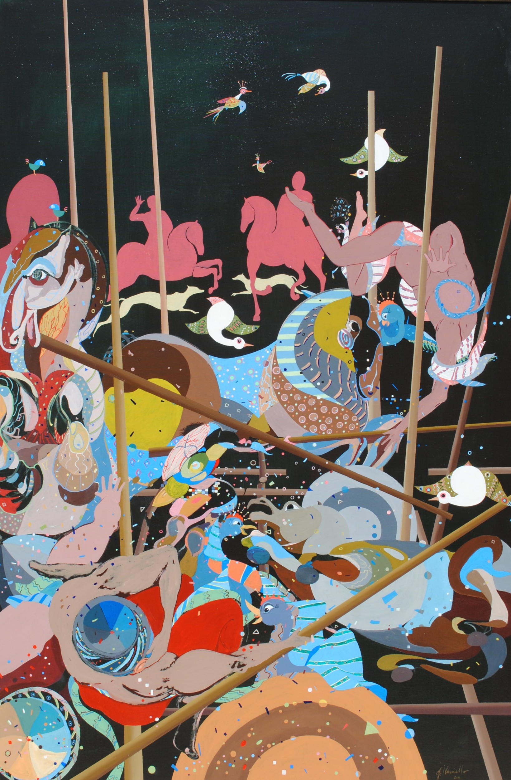 La scena è fiabesca, irreale, per nulla drammatica ed è resa ironica e allegorica dalla presenza di alcune figure, specie di oche che si aggirano quasi incredule di quanto sta accadendo attorno ad esse.