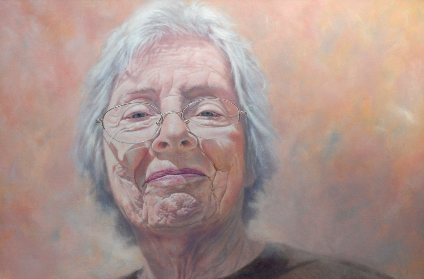 This portrait was painted just two weeks after the death of the subjects husband. The painting attempts to capture the vulnerability of old age. The work shows a very brave smile doing little to mask the enormous grief within. The softness of the skin and the ethereal colours emphasise the subjects emotional turmoil – the fear of living alone after so much love and companionship.