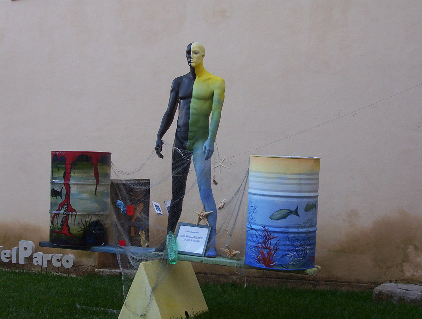 un manichino "uomo" in bilico su un asse ai suoi lati due bidoni "quelli dell'Esasperatismo" che raffigurano uno un mare sporco e irrecuperabile l'altro un mare pulito e pieno di vita.L'uomo deve scegliere da che parte collocarsi