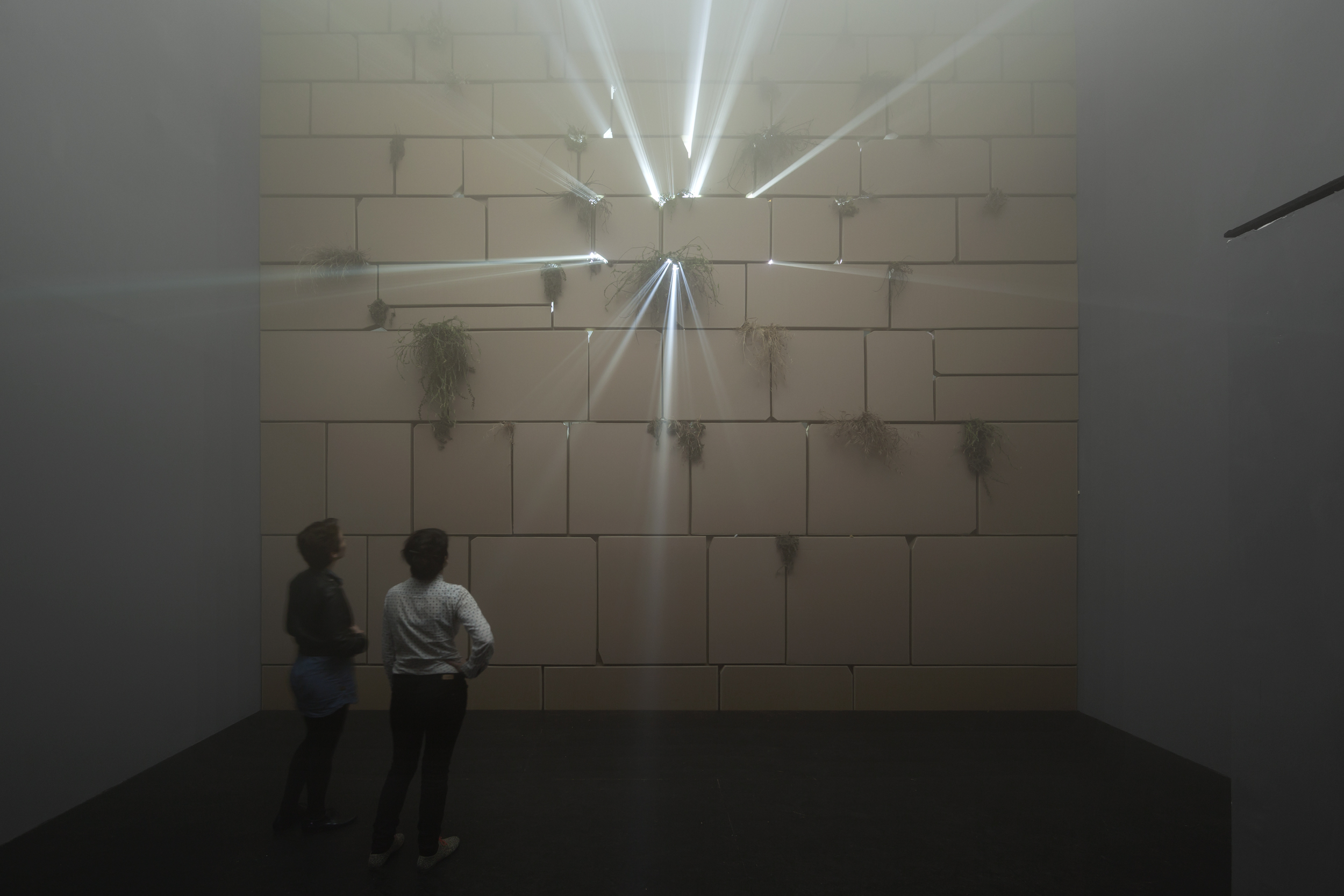 For “Above and Beyond”(2013), originally commissioned by the Center for Contemporary Art (CCA) Tel Aviv, Rodeh had grafted onto a white cube one of the holiest sites of Judaism and the most popular pilgrimage site in Israel, the Wailing Wall – or, rather, a recreation of it in cardboard. The viewer walked into a dark, smoky room, pulsing with music inspired by Middle Eastern rhythms, reminiscent of snake charming and calling to mind the performative manipulation of the highly symbolic reptile by its master’s hypnosis. The music, recorded especially for the work by Israeli composer Yoni Silver, was made by the human body: whistles, claps and foot stomps were the instruments that tantalized and drew viewers to the light piercing through the cracks between the wall’s “stones.” Clearly alluding to rays of holy light, Rodeh’s beams punched through the wall almost like stained glass windows in a cathedral. The Wailing Wall, where the Jewish people have come for generations to pray and wish and fling their faith against a stone fence, stood reincarnated at the CCA almost as if to entertain its new pilgrims. Rodeh was inspired not only by the Wailing Wall, but by Holy Land theme parks, biblical video games, recreated Jewish icons rented for Bar and Bat Mizvahs, and Las Vegas chic, as well as the show business of religion.