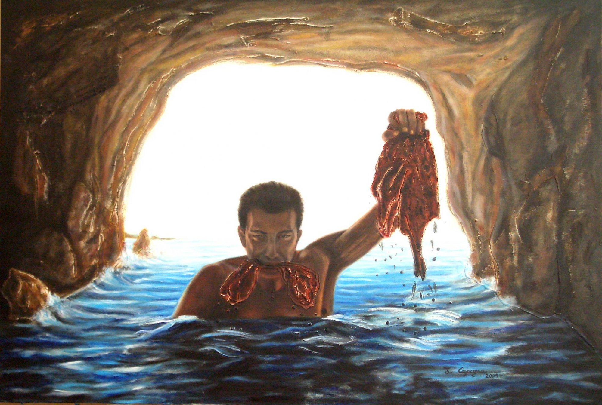 "L'UCCISIONE DEL SUPER-IO" non è rappresentato dall'uomo selvaggio o primitivo ma dall'uomo comune (dall'IO)che dopo una estenuante lotta uccide il suo super-io (originato dalla interiorizzazione dei codici di comportamento,ingiunzioni, divieti, ecc..)cercandolo fin dentro la grotta immergendosi nelle sue acque (simboli di utero, rapporto materno,origine del super-io)per liberarsi dai suoi più alti ideali etici e morali, vissuti come un'entità sovrannaturale inducendo uno stato illusorio permanente autoipnotico nella propria mente. La luce alle sue spalle simboleggia la coscienza, l'autoconsapevolezza, che l' uomo ha acquisito.