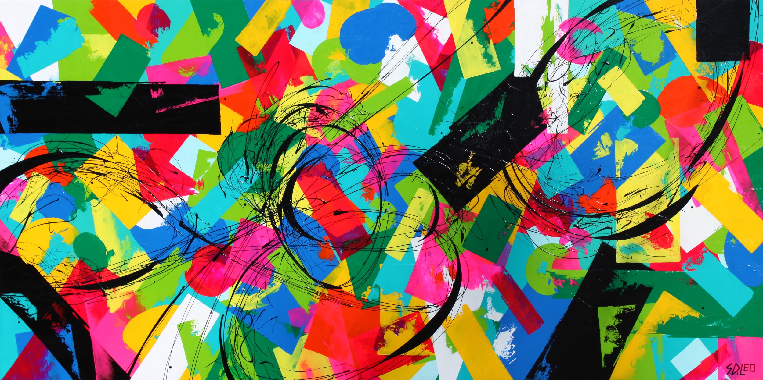 This artwork is a recollection of a childhood memory, a visit back to my hometown where I grew up. A quaint little northern town where I was surrounded by nature’s greenery, wildlife and the calming blue of Lake Superior. The accents of red, pink, yellow and orange symbolize the warmth of the summer sun and the warmth of kindness of the townspeople. The solid black bars represent the strong foundation of my upbringing. The black fluid lines energetically move throughout the canvas, while the intense, vibrant colours convey joy and exhilaration.
