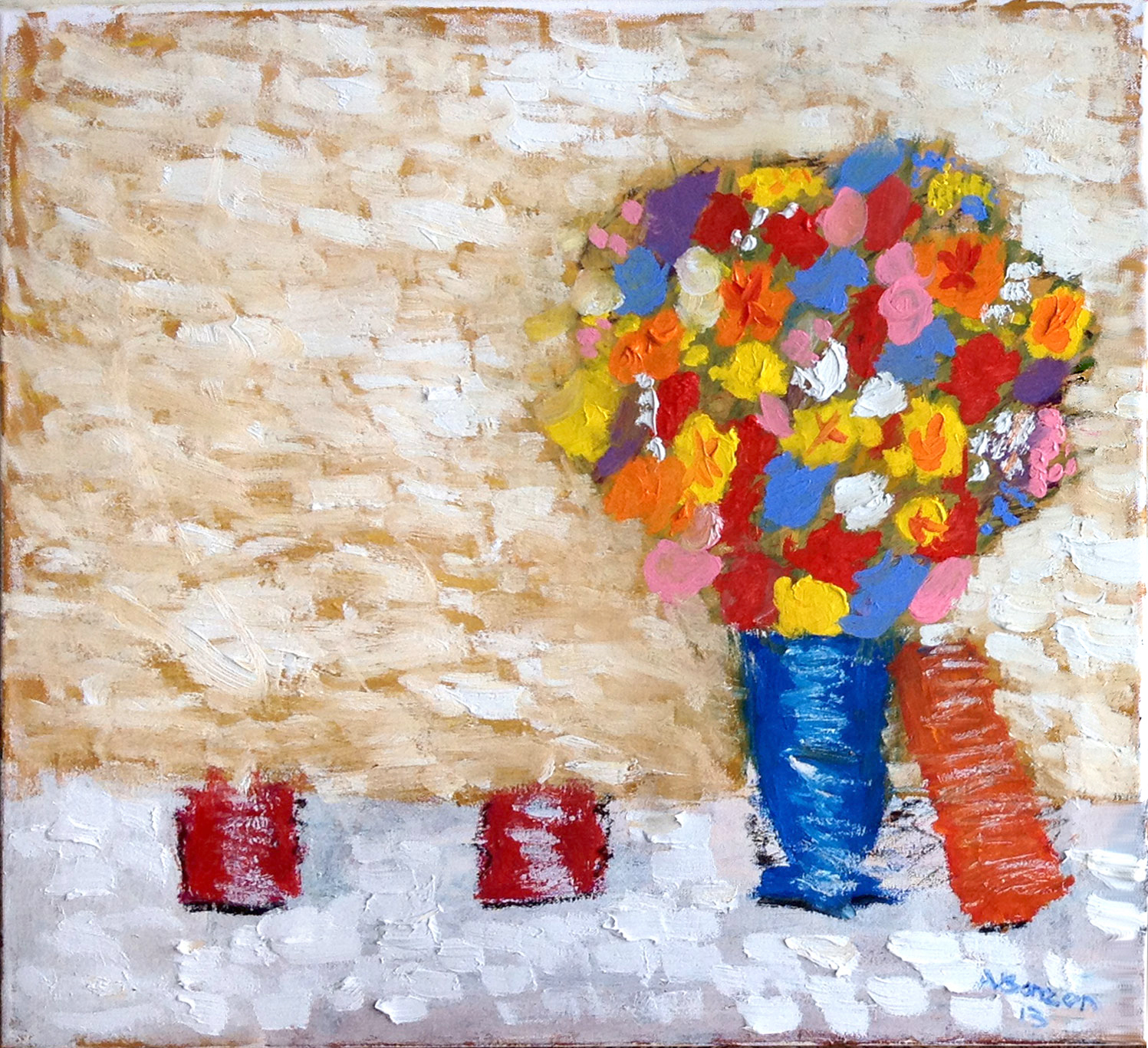 I was looking at a photo of some flowers on the internet and it gave me ideas. My mother lights candles every night so I painted candles with the vase. I added the book, colours of the flowers and the background from my imagination.