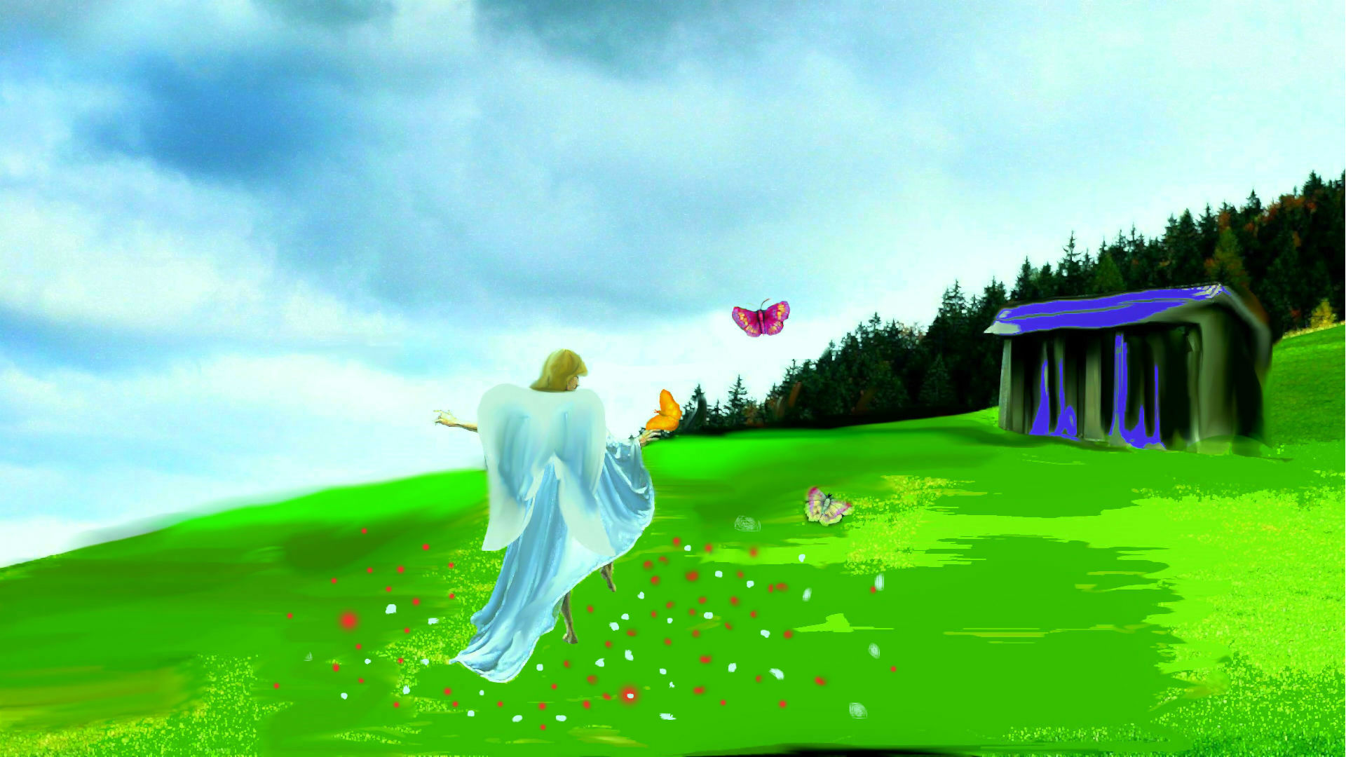 A Giulio, non è una critica solo verso l'uomo ma verso tutta l'umanità, l'angelo vuol dire amore le farfalle rappresentano la vita, il prato la serenità il cielo che se guardi non è limpido le nostre angosce. L'angelo danza per riportare a noi tutti un cielo più sereno. Se ha i baffi mi dispiace non è venuto molto bene