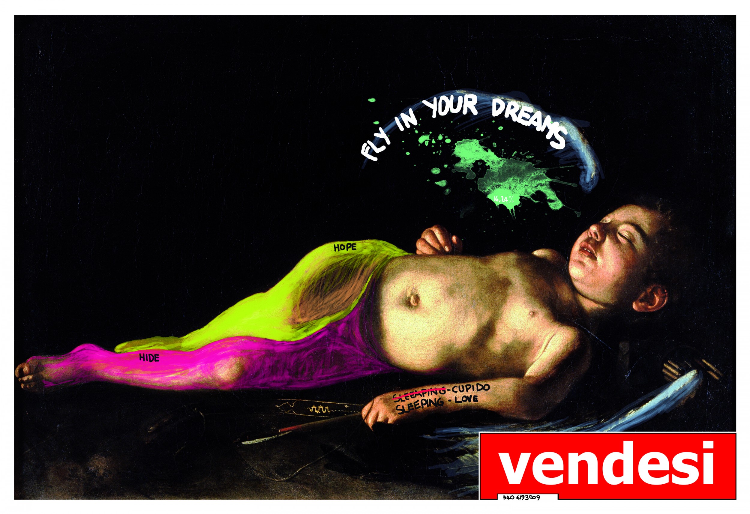 Sleeping Cupid Grafica Digitale, Amore, Sacro / Mitologico, Computer graphics, 105x72cm Computer graphics Nero art love smile contemporaryart cupi Daprè dal dipinto di Caravaggio delle stesse dimensioni dell'originale. Spina mette in discussione il significato e il valore dell'arte antica inghiottita nei processi di commercializzazione (VENDESI) Inserita 12 anni fa 0 Mi piace Non piace più 0 Commenti 168 Visite Condividi Facebook Twitter Google + Non ci sono mi piace Commenti 0 Inserisci commento E' necessario effettuare il login o iscriversi per inserire il commento Login