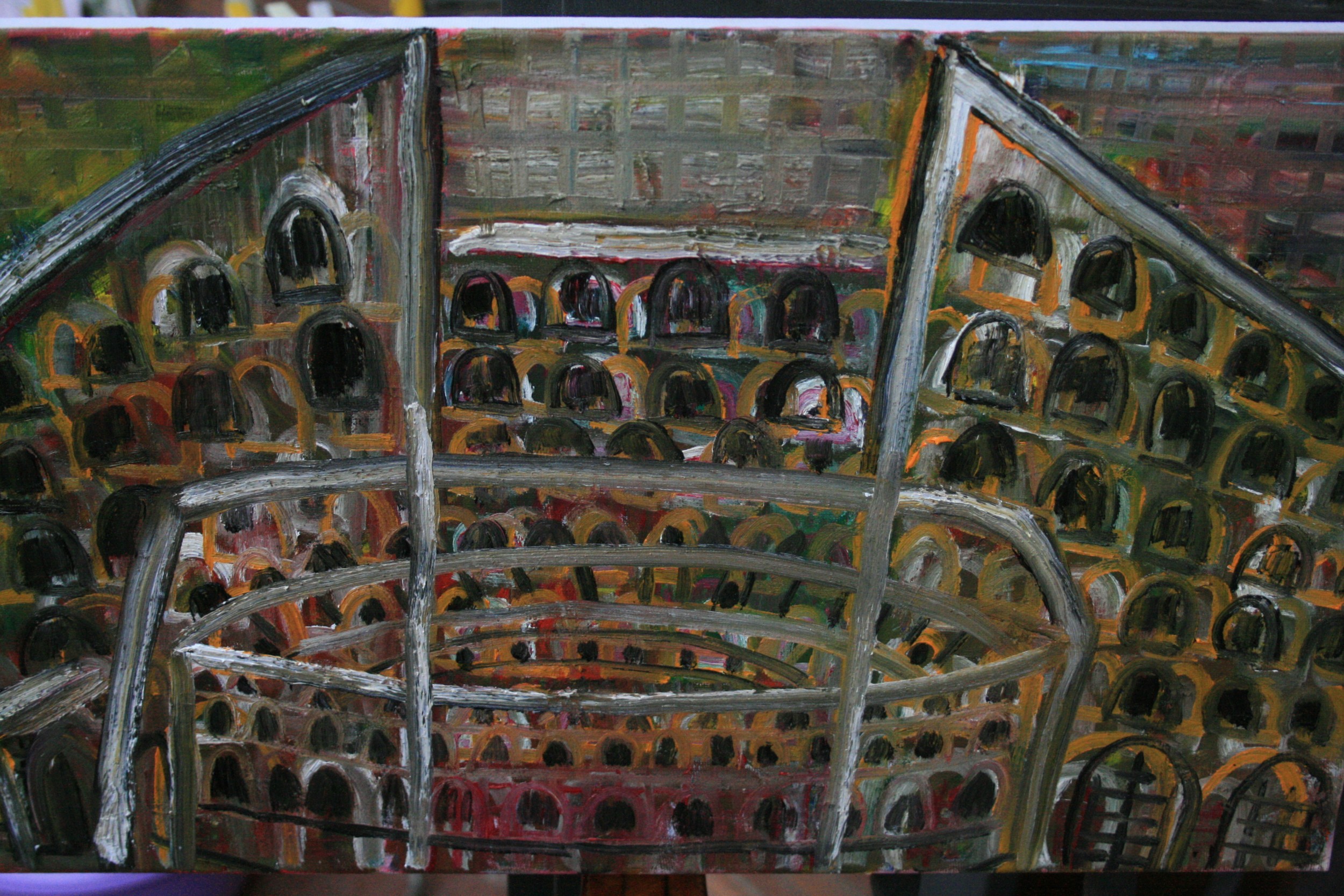 la tua crescita è arrivata ad una scelta pittorica che definire pop la quale nn cura più la perfezione delle fome,ma va direttamente all idea alla sostanza lasci all osservatore immaginare tutto il resto,l idea della romanita nn potevi esprimerla meglio ,arriva con questo colosseo diretta senza troppi fronzoli,rispecchiando la tua persona in pieno.