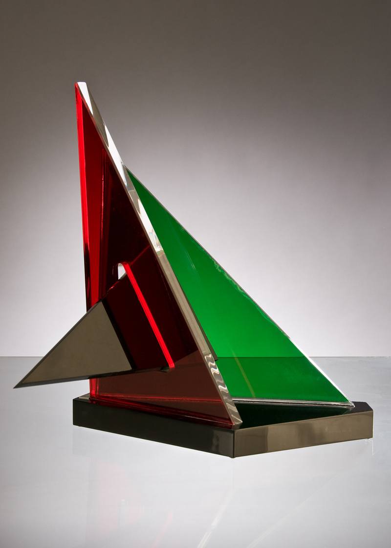 "Iridescent" Twin #2" an "archetypal" form consisting of 3 angular shaped abstract pieces using 2 iridescent colors resting on black angular base. a minimalist sculptural prototype with a balance of rythms and lines which seem to interact with space emerging fully as 3-dimensional art