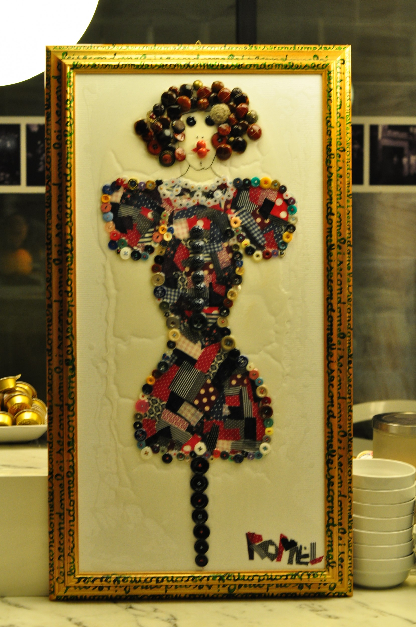 Ritratto di donna creato attraverso l'utilizzo di bottoni, ciascuno di essi,rigorosamente cucito a mano, dove il colore del cotone e' in netto contrasto con quello del bottone, cuciti intorno alla veste, a delineare i tratti somatici, a formare una folta chioma, riccia, rossa. Ritagli di stoffe a formare una veste, il tutto fermato su tela con una colata di flatting...il titolo dell'Oprea, dipinto all'infinito, ne adorna la cornice...