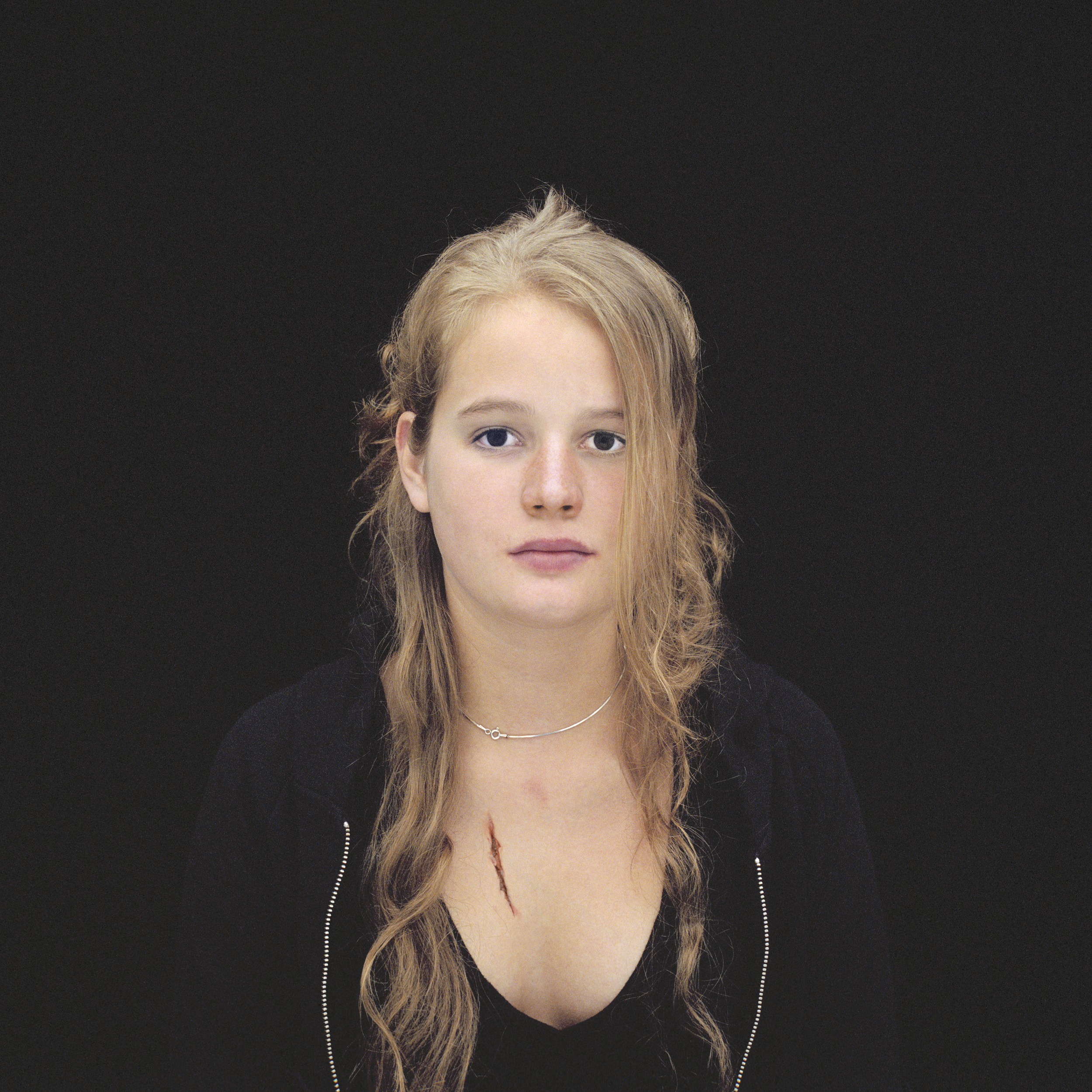 [...] Croyants sans le savoir ? Warning, c’est l’avertissement, l’alarme, des feux de détresse… Global Warning*, si proche du Global Warming, le danger qui guette. Pour Patrick van Roy ce pourrait être ‘un bonheur à court terme, paradisiaque et dévastateur’, ‘une nouvelle religion dont les églises seraient au milieu du salon et dont les apôtres, tels des barbies parfaitement impersonnelles, trôneraient sur l’étagère de notre enfance.’ Enseignant à l’INRACI à Bruxelles, Patrick van Roy a fait poser ses élèves de 2006 à 2009. Un important travail avec Photoshop a été réalisé pour mêler à chaque fois les traits d’une fille à ceux de trois garçons et fabriquer ainsi une galerie de visages qui n’existent pas. Patrick van Roy : ‘C’est personne, des filles idéales comme le serait la poupée Barbie, le jouet pour lequel on a le moins de respect car il est remplaçable : un objet basique et bête auquel on coupe les cheveux ; une beauté désincarnée et froide.’ La frontalité est forte et pourtant les yeux ne nous regardent pas. Ils sont sans reflet et paraissent du coup si vides, comme figés pour l’éternité. Et chacun de porter sa douleur, son stigmate de sang coagulé : ‘de ces blessures qu’on inflige aux ados et qu’ils s’infligent à eux-mêmes, mais ne saignent pas, comme s’il s’agissait de fascinants et attirants cadavres’[...]