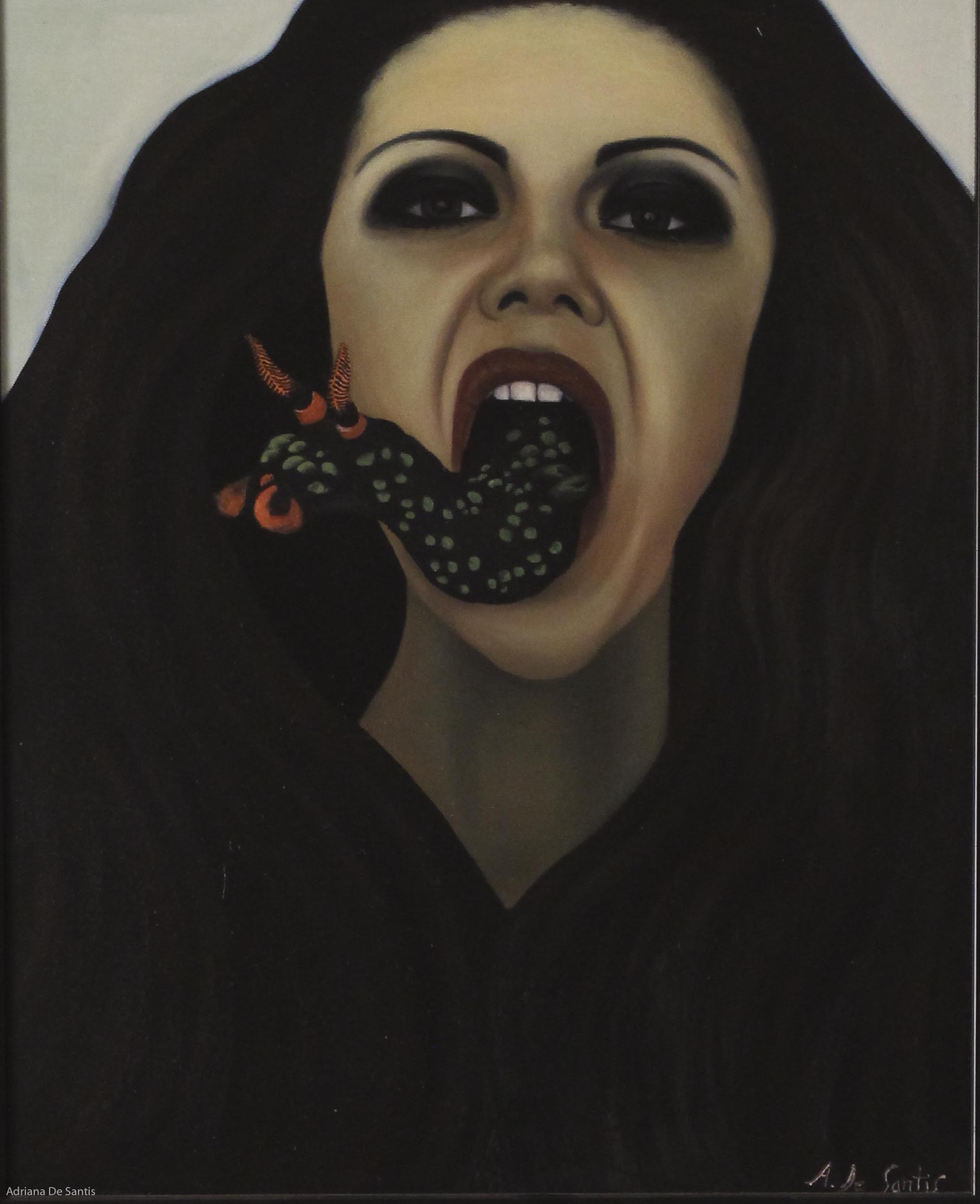 Il vomito velenoso di un'intima scomodità celata è ciò che, con prepotenza e timido coraggio, diviene materia nella bocca del volto che abbiamo davanti ai nostri occhi: una lingua velenosa che denuncia il malessere fisico/interiore che decidiamo di tenere per noi.