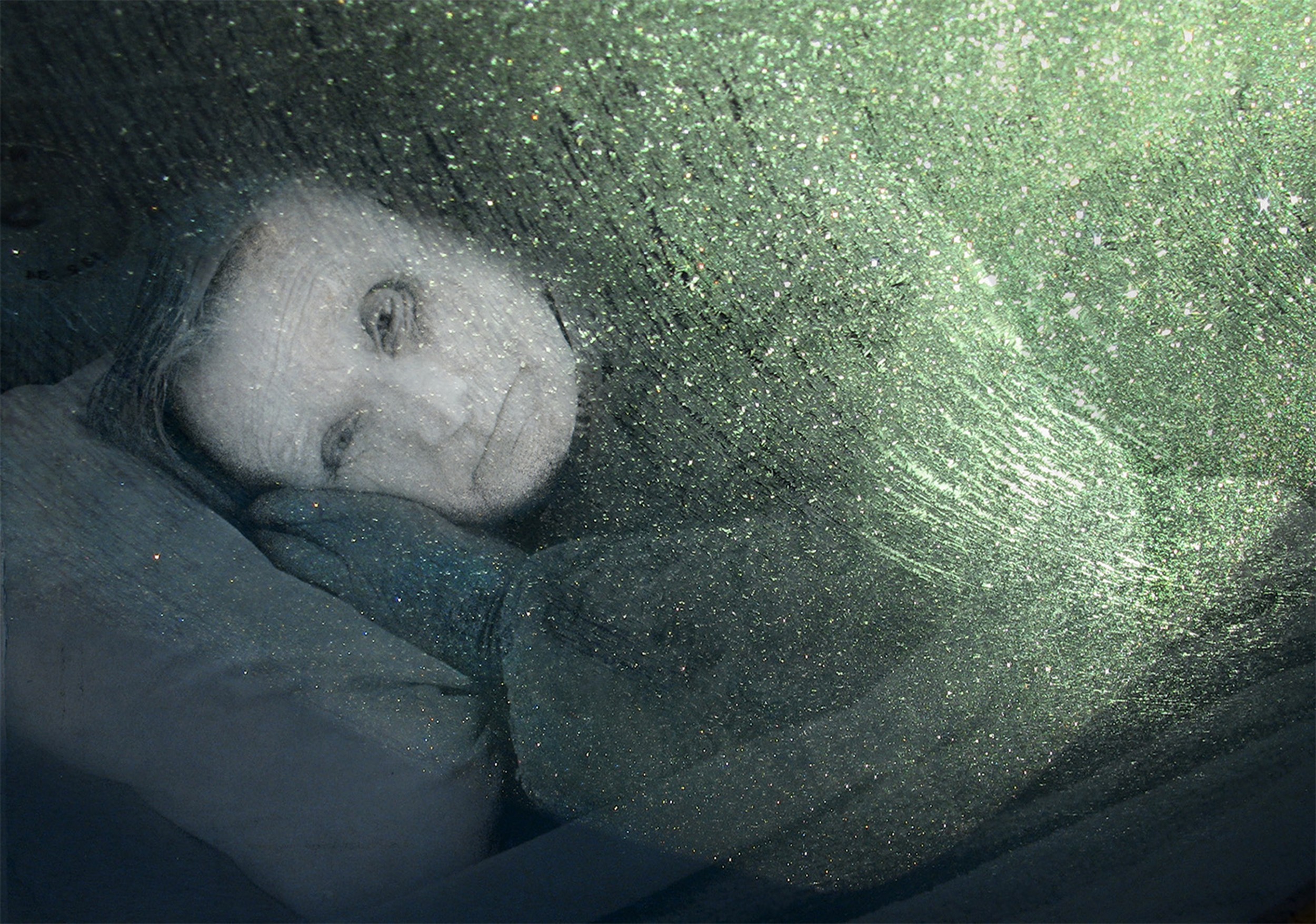 Whiteness and water droplets signify purity and cleansing. Such pictorial tensions may play in our minds as we contemplate a frozen photographic moment. This use of digital imaging is intended as a gateway to consciousness. The rhythms of the physical body and the elements are stopped but still present. An enlightened darkness is presumed ethereal - a precious gift when there is nothing to be gained. The image continues to live.