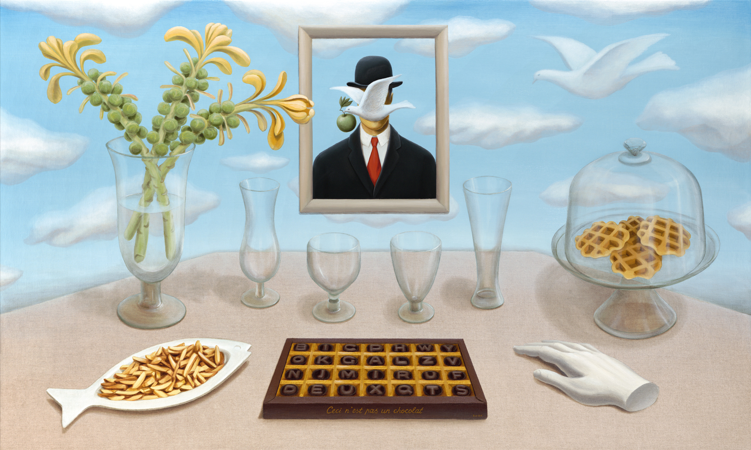 Brussels sprouts are flowering over diamond shaped table covered with clear (unpainted) Belgian linen. Different shapes of beer glasses placed centrally in reference of the centuries old tradition of making countless types of beers (whites, browns, lambics, krieks, faros, ales etc) and paring them with different food. Legendary "Belgian frieten" became a worldwide snack food mistakenly called "French fries" in some countries (USA). Viewer can also see the Liege/Belgian waffles, and box of Belgian chocolate as an alphabetic puzzle. On the right side is the famous hand – the symbol of Antwerp city-center of diamond trade.