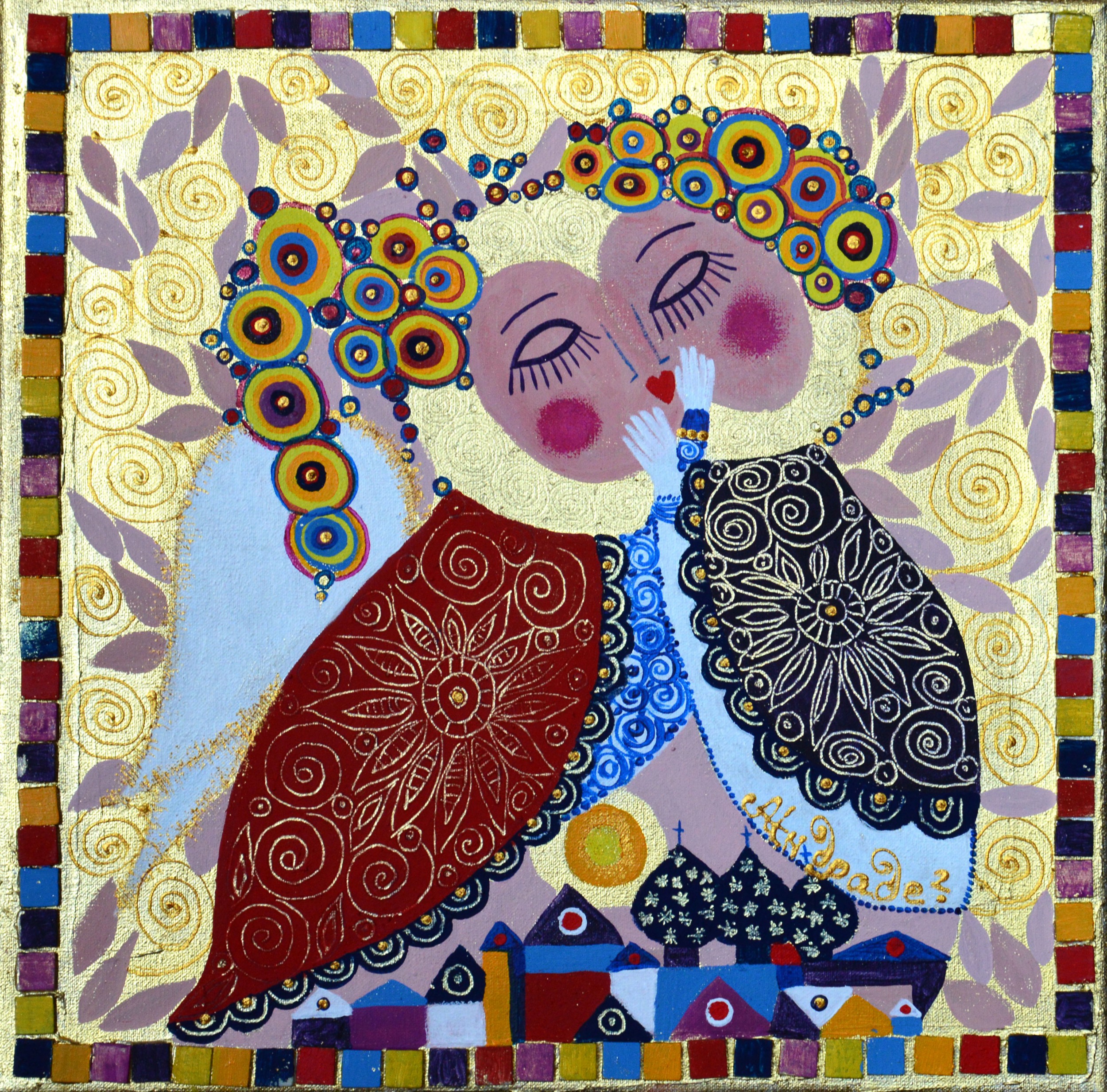 In the painting two people as birds are kissing with love, desire and passion. They are happy and free. There are a divine kiss of two angles.