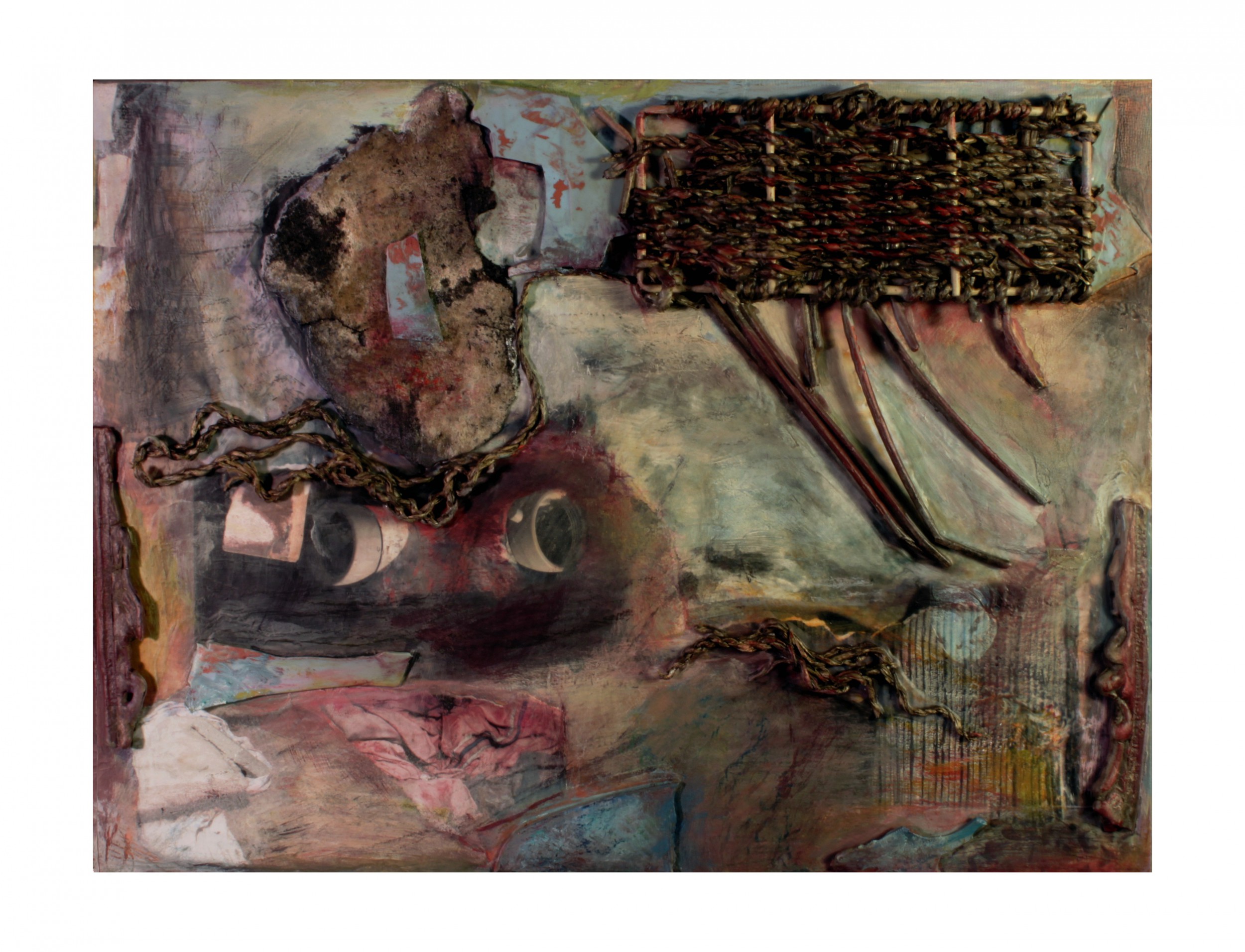 I discovered this impressive, empty factory building in an area that has been designated architecturally significant in Chicago. The W.M. Hoyt Building harkens back to 1909 and has been given Landmark status. The loading dock was scattered with refuse and signs of homeless people camping out here - sleeping bags, comforters, and even the remnants of a wicker bicycle basket which I used in the piece.