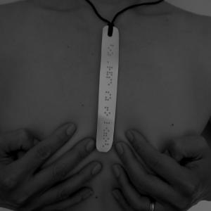 Dunque, dall'esperienza percettiva e simbolica del Vuoto, l'installazione prevede il suggerimento della condivisione di questo stato emotivo, esistenziale. Il tutto attraverso la distribuzione del gadget: una piastra sottile di alluminio, che può essere indossata a collana (come nelle migliori tradizioni dei gadget per i "brand" commerciali) recante il NO LOGOS, il negativo del versetto in braille.