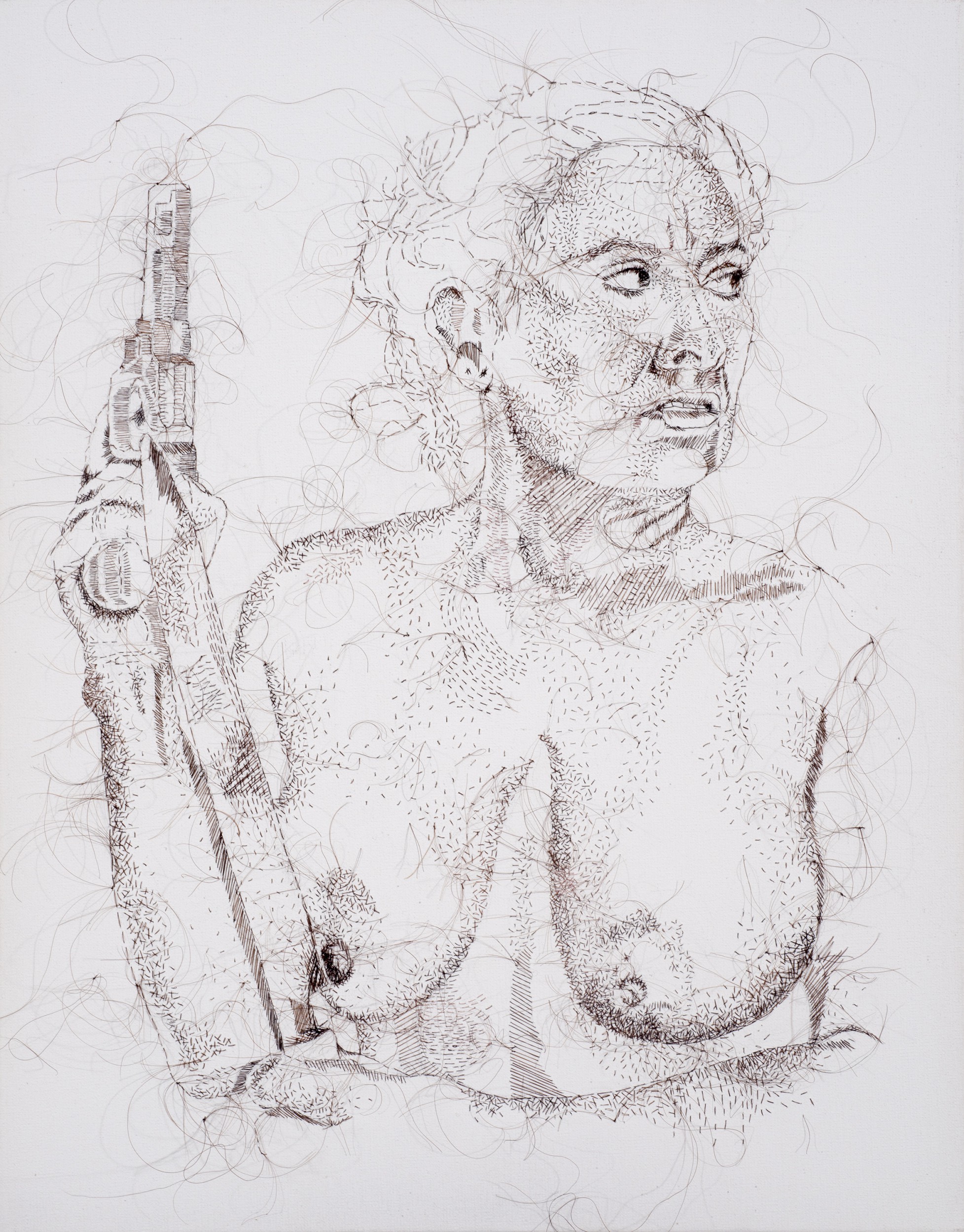 This artwork is created solely with the artist's hair. The hair is hand-sewn with small embroidery needles into canvas. Film images of fetishized-hyper-violent women served as the catalyst for a body of artworks I created in 2012-13. This series is a thoughtful examination of the relationship between violence, sexuality and femininity. Jean-Luc Godard posited that all he needed to make a movie was a girl and a gun; the same premise seems to be embraced by today’s filmmakers. There is a plethora of images in film which depict women as sexual creatures in hyper-feminine attire toting weapons. Commercial potential is maximized by the trifecta: phallic weapon, sexy woman, and promise of gratuitous violence, however, there is a discrepancy between the mythic image of the female crime fighter/criminal and society’s multifaceted reality. There is something visually disfigured about a woman holding a weapon. The sight runs counterintuitive to ‘mom & apple pie’. The veracity of the pose belies the notion of sexiness and the female figure becomes contorted with a quiet sense of impending violence.