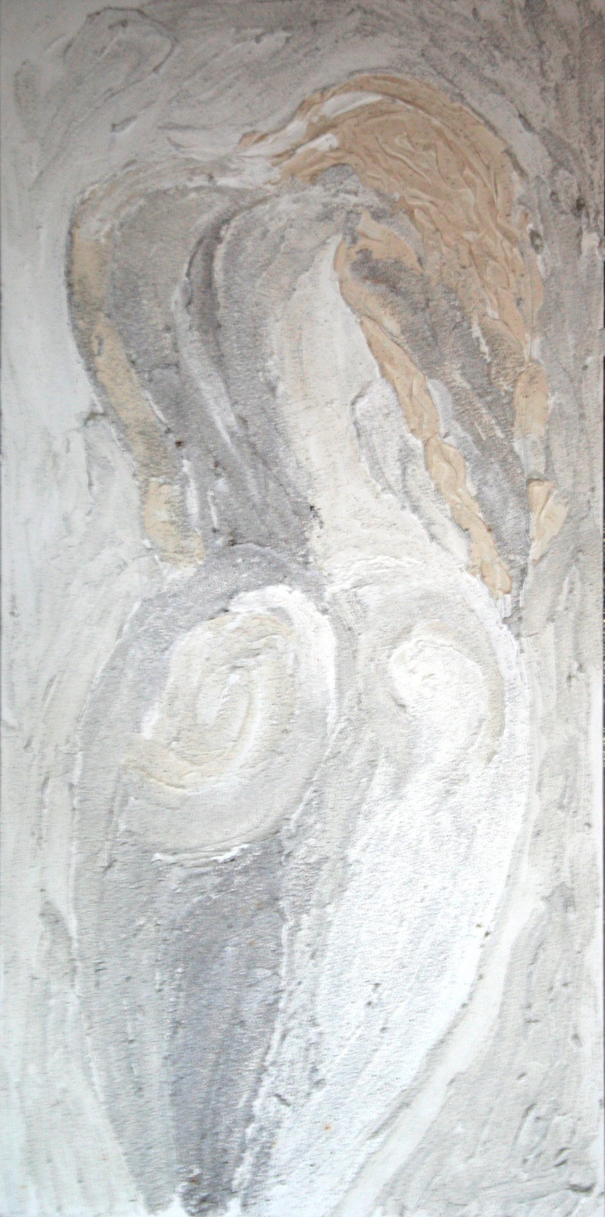 Dipinto tecnica mista su tela. La figura della donna è, nella mia pittura, simbolo dell'Anima. A volte dolente per un retaggio antico, a volte in fuga da questo, a volte smarrita nella stessa fuga. Qui l'Anima si cela, in un invito sensuale e malinconico