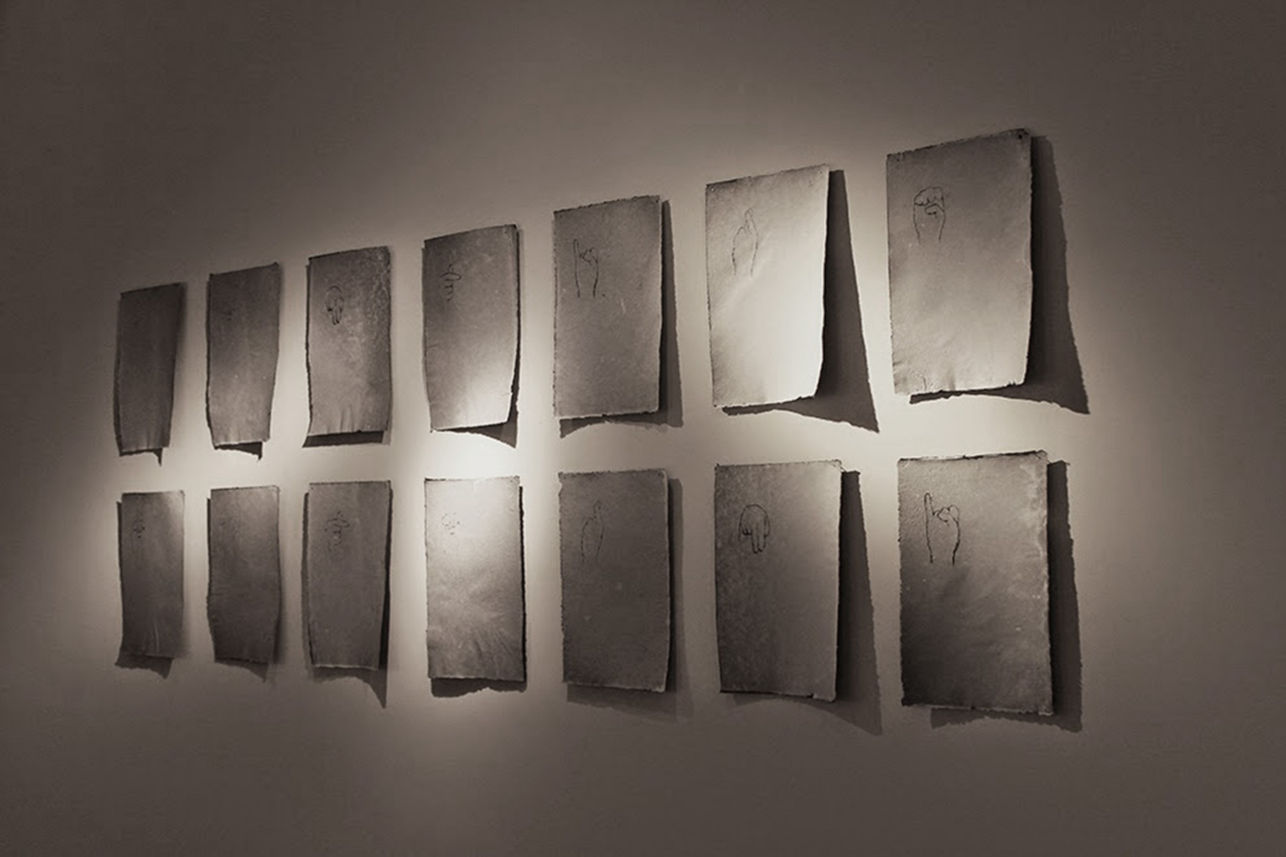 Sono 14 fogli di carta di cotone e abaca autoprodotta disposti in due file da 7. Le immagini delle mani vanno a comporre sulle due righe le parole “sentire” ed “esterni” nel linguaggio LIS (sordi). I due termini, uno anagramma dell’altro, rilevano una serie di associazioni e contrasti, ancor di più se espressi nel linguaggio di chi di udito ne è privo.