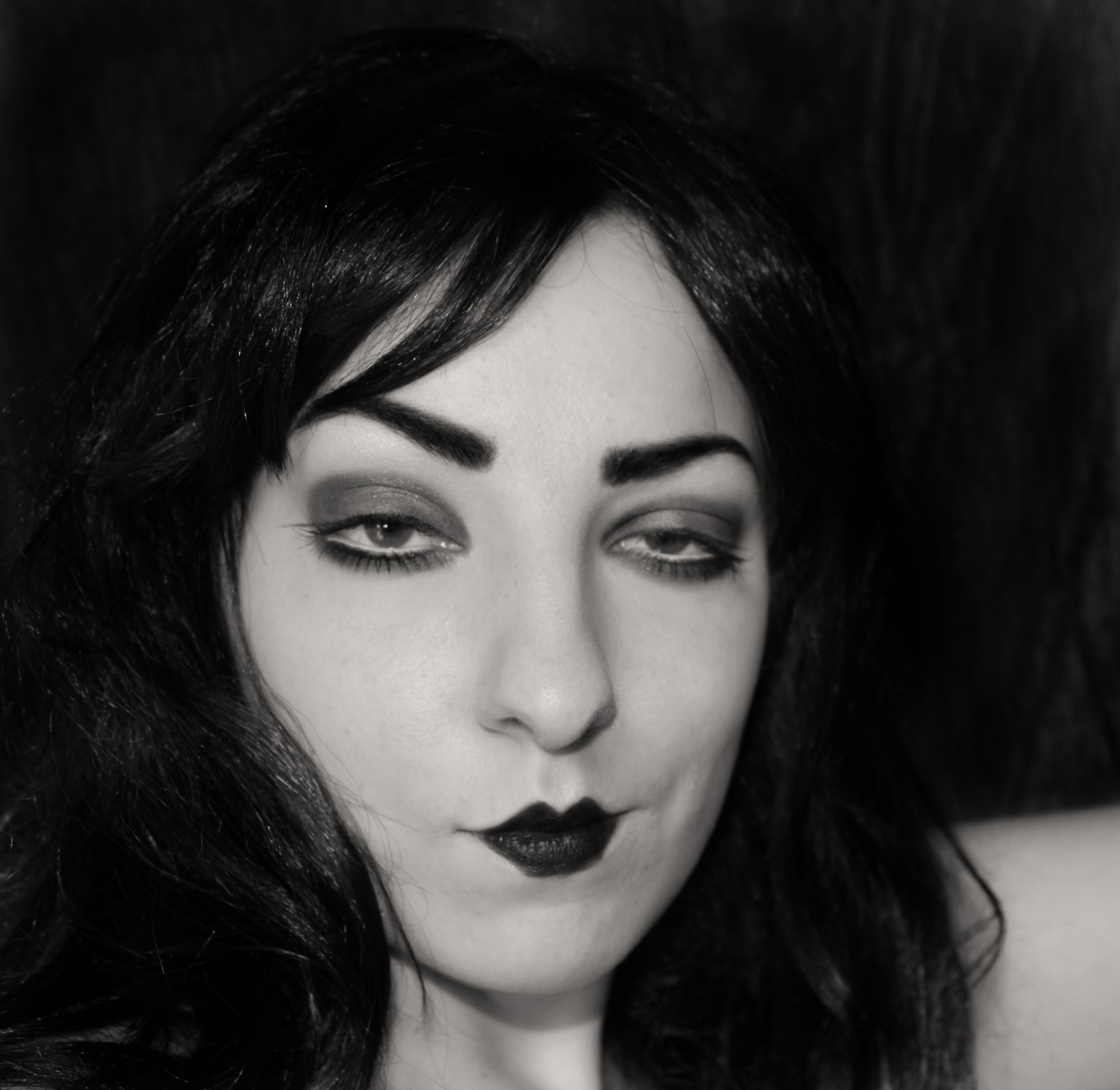 Un’esperienza creativa che si avvale di metodi di indagine identitaria per la ricostruzione del personaggio rappresentato, cercando di rimanere il più fedele possibile alla sua personalità, al suo look e al suo contesto storico. In questo “gioco della personalità” sono diventata modella di me stessa e ho impersonato la diva-personaggio intrigante e fatale, cercando di imitare le esagerate espressioni del viso, la teatrale gestualità, lo sguardo ammaliatore e il suo temperamento decisamente trasgressivo. È stata dedicata una particolare attenzione anche per quanto riguarda l’aspetto estetico: ho ricreato l’elaborato makeup accentuando il pallore del viso e intensificando lo sguardo in modo da riproporre i celebri “occhi bistrati” di Theda. Attraverso parrucche nere, bigiotteria e vestiti ispirati ai primi del Novecento ho reinterpretato il suo look dal gusto “egizio-vampiresco”. Questa serie di autoritratti è stata realizzata in bianco e nero tramite una fotocamera digitale reflex montata su cavalletto; ogni fotografia, poi, è stata rielaborata al computer attraverso il software Photoshop. Da questa serie è stata selezionata una fotografia, successivamente incorniciata con passepartout, per essere esposta durante l’evento Art Night- La Notte degli Oscar il 21 giugno 2014 presso l’Accademia di Belle Arti di Venezia.
