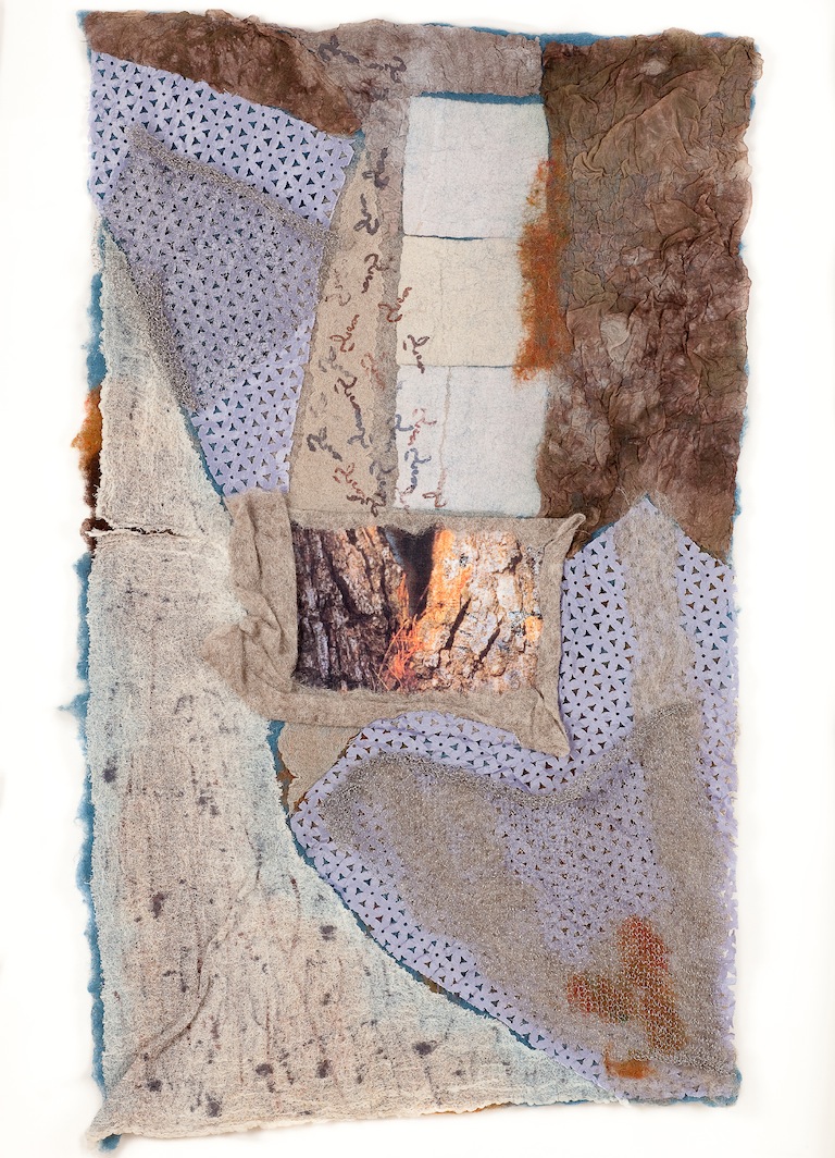 Materiali: lana bergshaf e merino, seta, chiffon, poliestere, garza di cotone, stampa fotografica su tela, rete metallica.