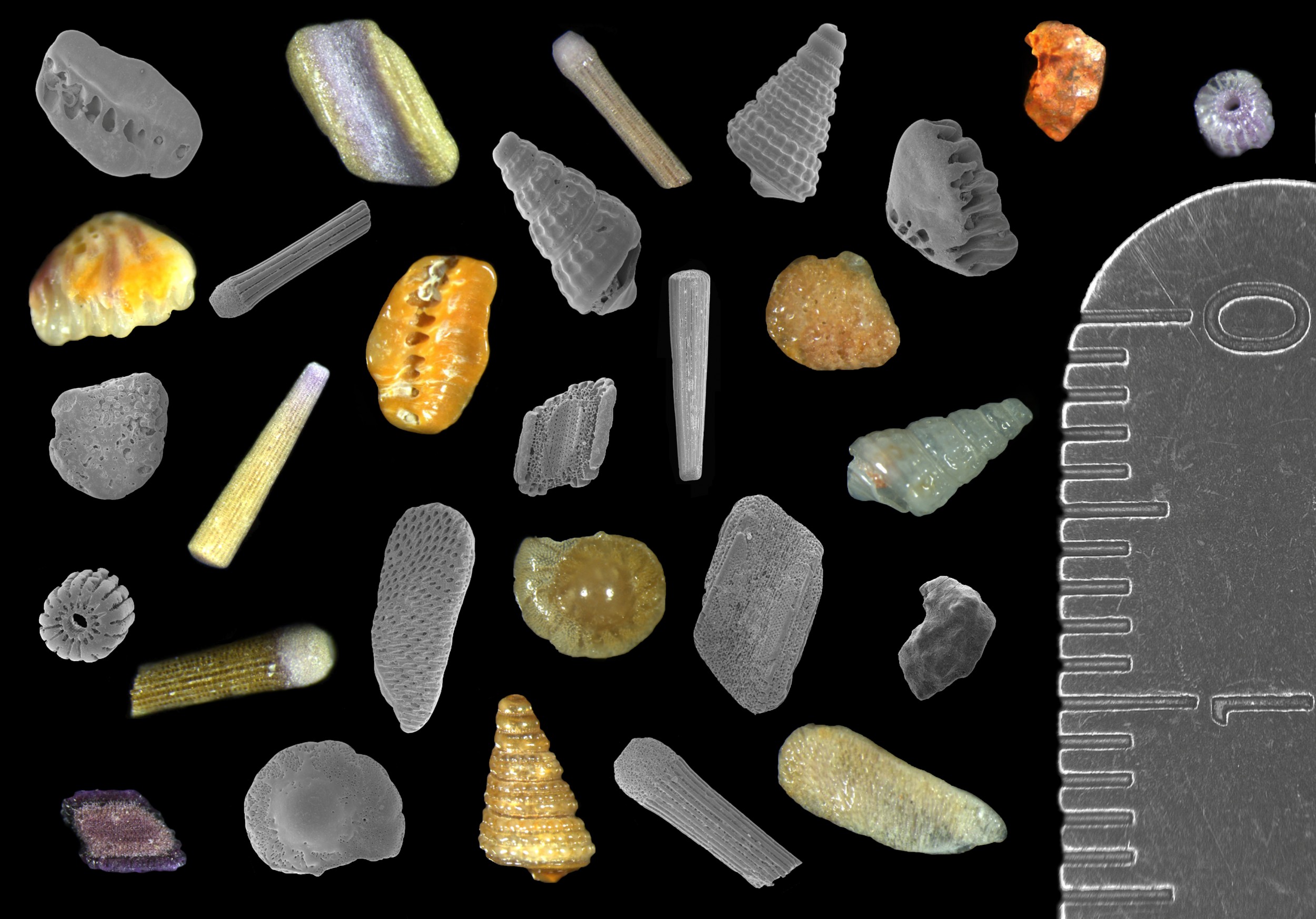 Thirteen grains of sand collected from Coogee beach in eastern Australia are displyed. Each grain of sand appears twice. Once as a light microscope image, displaying the true colour of the sand. Once as an electron image, displaying the texture of the sand in more detail. The grains of sand are to scale to the ruler (cm) on the right side of the image.