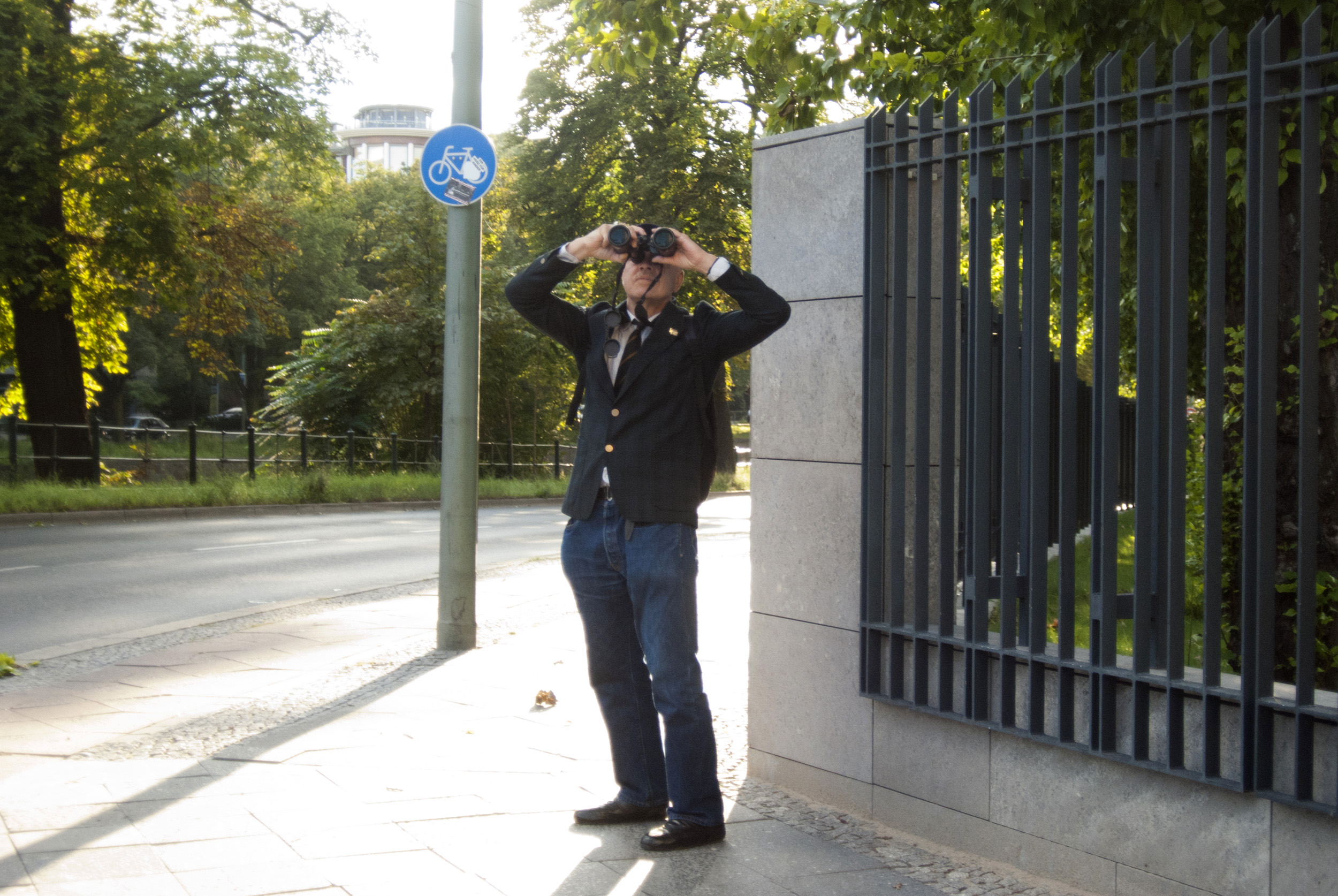 L’immagine (costruita o trovata?) di un personaggio (passante o figurante?) intento a osservare, grazie all’uso di uno strumento, di un binocolo. Lo studio e la comprensione del reale necessitano di strumenti (tecnici, scientifici o intellettuali) che mediano il nostro rapporto con esso. Nel momento in cui ci interessiamo a qualcosa, limitiamo il nostro sguardo a quella cosa: se guardiamo lì non vediamo qui, se pensiamo al futuro non siamo nel presente.
