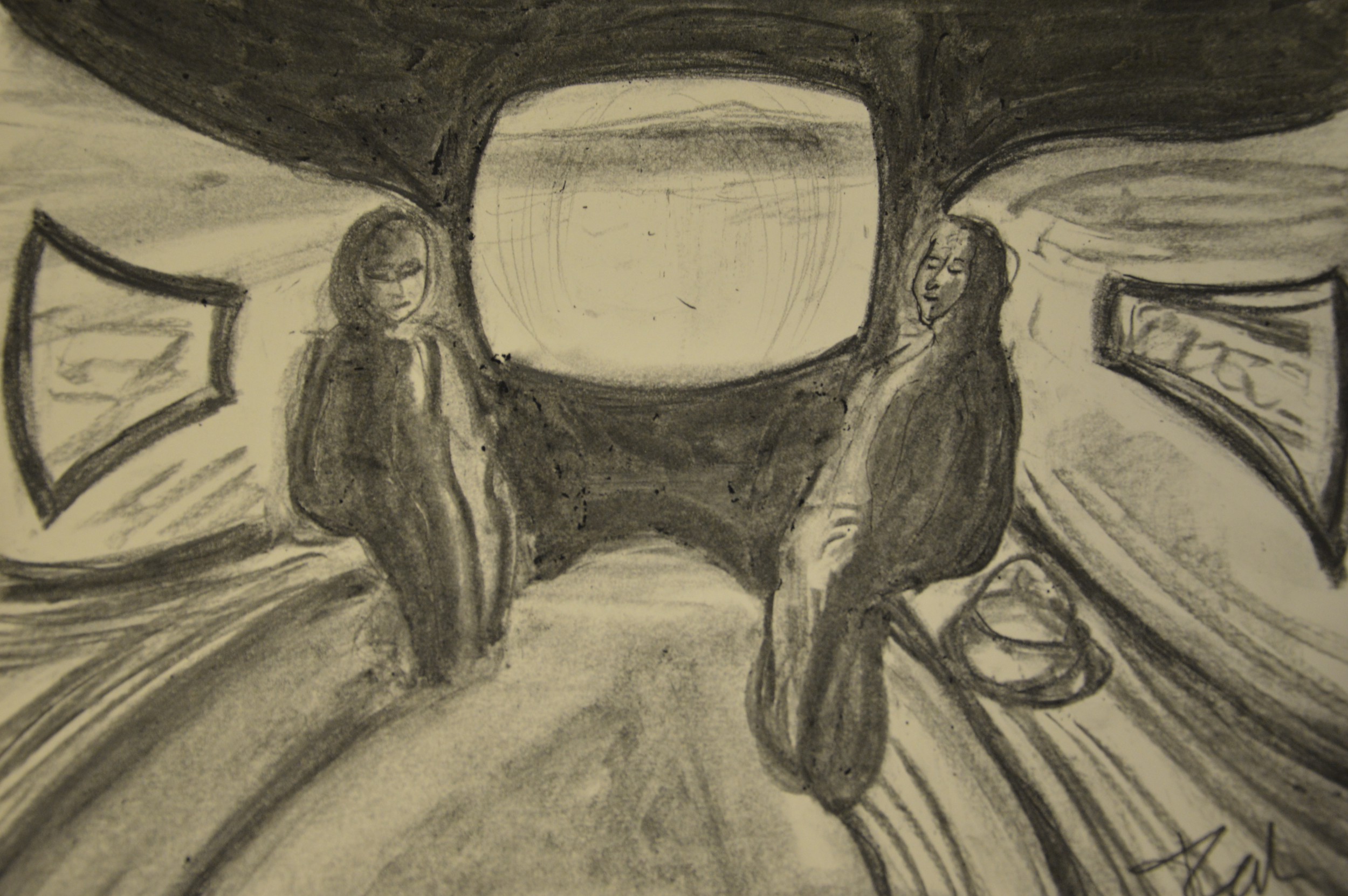 Visione grandangolare per il viaggio in treno di due donne. La prospettiva rinasce e si evolve in una dinamica espressione grandangolare. I parametri noti svaniscono come le certezze delle dimensioni e delle proporzioni. Il presente è vissuto come in un incubo, in un sogno....dove si vive sospesi un un mondo dinamico, un mondo che sembra muoversi e come il treno va e ti porta via con se.