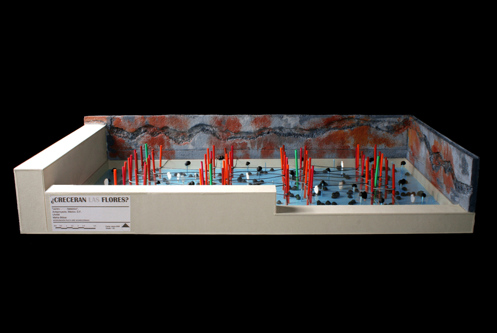 This monumental installation refers to the ‘Masacre de Tlatelolco’, a series of demonstrations and repressive actions occurred in Mexico City in 1968. The installations is composed of 68 cylindrical elements alluding this emblematic date. 64 are chromatic variations in red, symbolizing dead bodies and killing actions; the other 4 have been colored in green, recalling the lights used by police airplanes to attack the people. White elements refer to the left hands symbolizing the sign to fight. Military hats recall the military strategy. In the wall we can see a wound, referring the pain suffered during and after the attack. The tile of the piece appears under questions marks, ¿Crecerán las flores?, alluding to the amalgamation of doubt and hope.