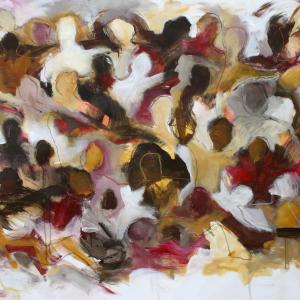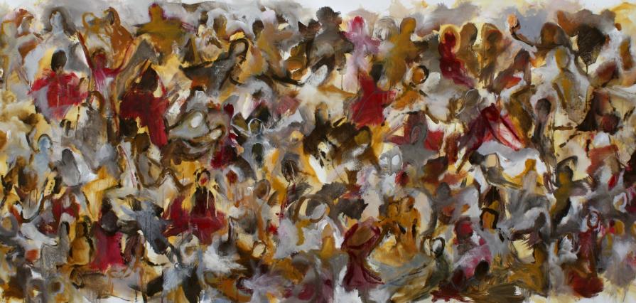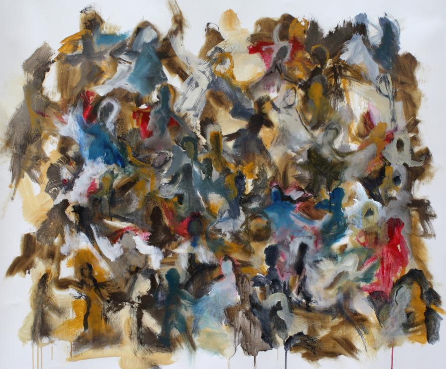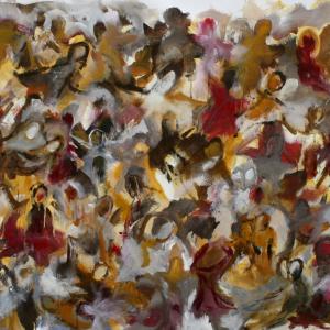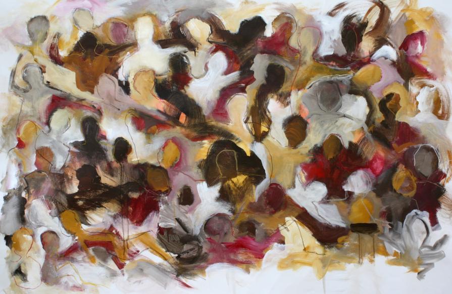 Nella folla le singole individualità sono distinte ma strettamente connesse in un groviglio o in una rete che diventa a sua volta una singola entità. L’individuo oscilla tra il sé, le proprie caratteristiche e l’atteggiamento generale della folla, la sua momentanea omogeneità. Le singole espressioni sono trasformate in colore, ogni tono cromatico è sfumatura o diversità emotiva del singolo, mentre il tratto delinea la gestualità e il movimento di ogni individuo. Le persone si abbracciano, si parlano, si guardano, dormono, litigano, soffrono, condividono.