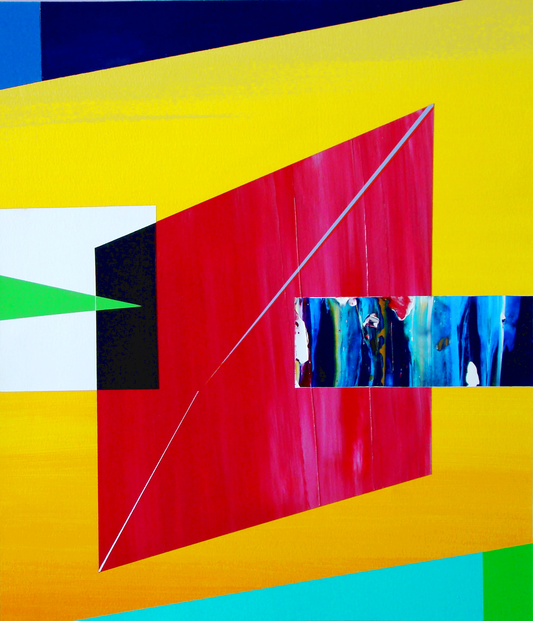 My approach is very intuitive; through the use of primary elements aligned around color, I create space-contained systems driven by shapes, layers, and shades. I use a variety of materials including traditional and nontraditional tools such as squeegees, screwdrivers, combs and palette knife. Through its combination; the revealing processes of previously laid down layers and space, emerge. Within their intertwined coexistence, transversal vibrations to the perspectives senses are created. Transitioning from the particular to the magnificent utilizing the tension of the space and its multiple dimensions of materials and intention drivers. “These painting is all about exploring the color balance, the intuitive and all the in between”