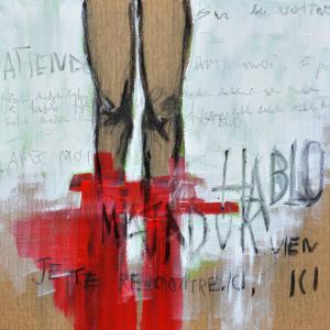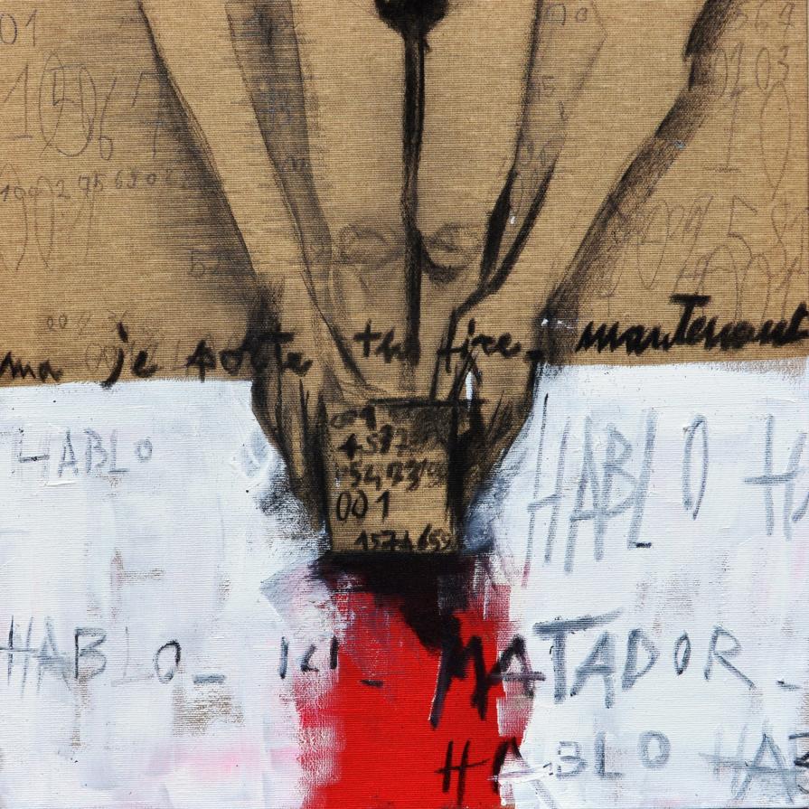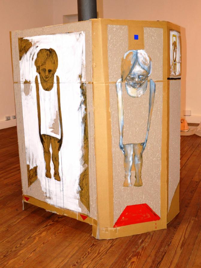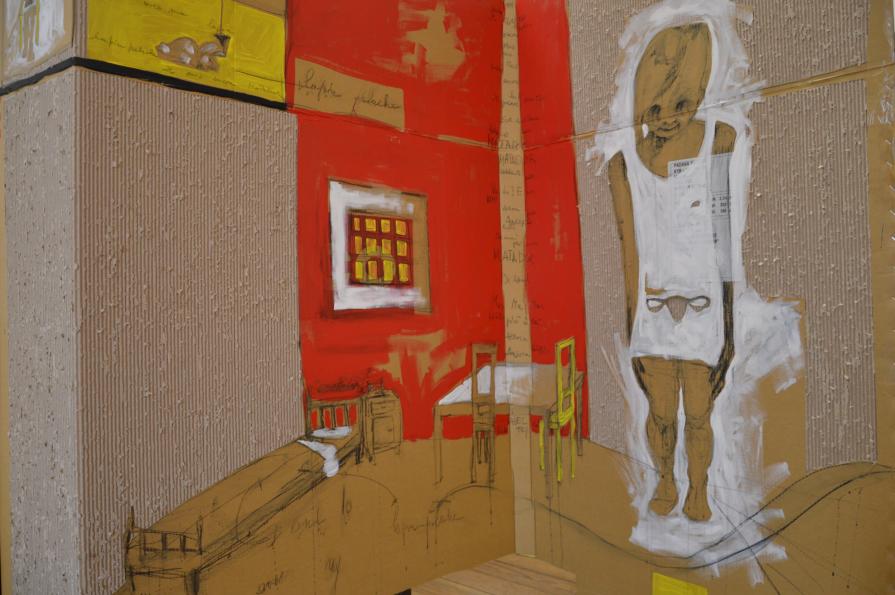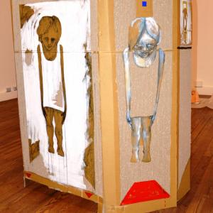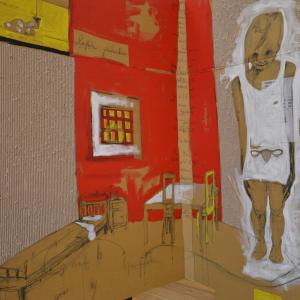 Su di esso si dipana una figurazione narrante. Intima, delicata e lacerante insieme, essa lega l'intervento dell'artista al il supporto dove il cartone viene a volte "spelato", "scarnificato", a volte "salvato" nella sua superficie.