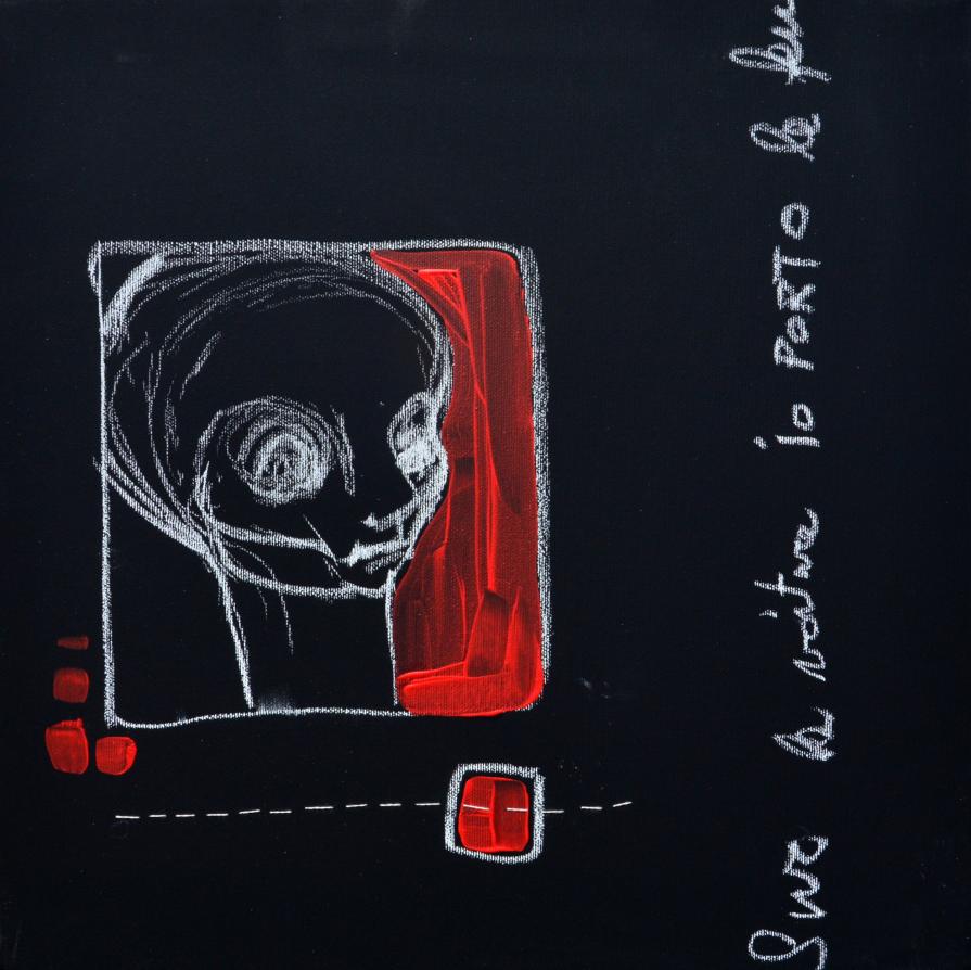 Qui alle immagini e alla scritte e ai numeri, cucita con il filo e il modo dell’imbastitura, compare sul nero una linea tratteggiata, come precaria possibilità di ricucitura tra dentro e fuori.